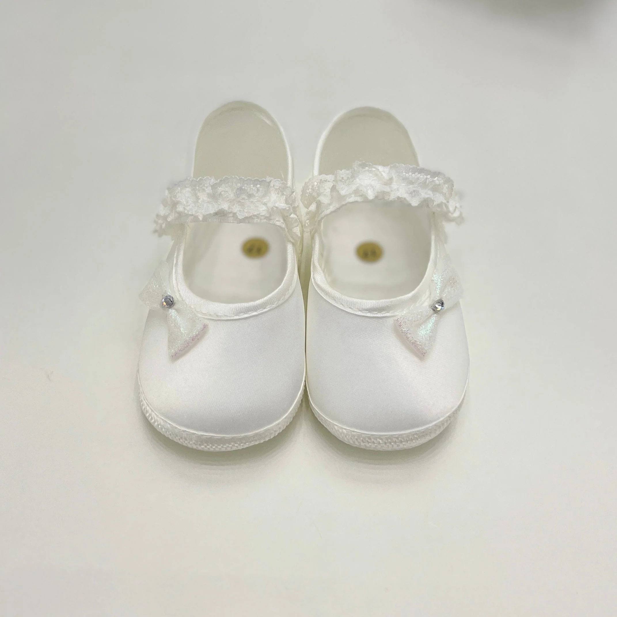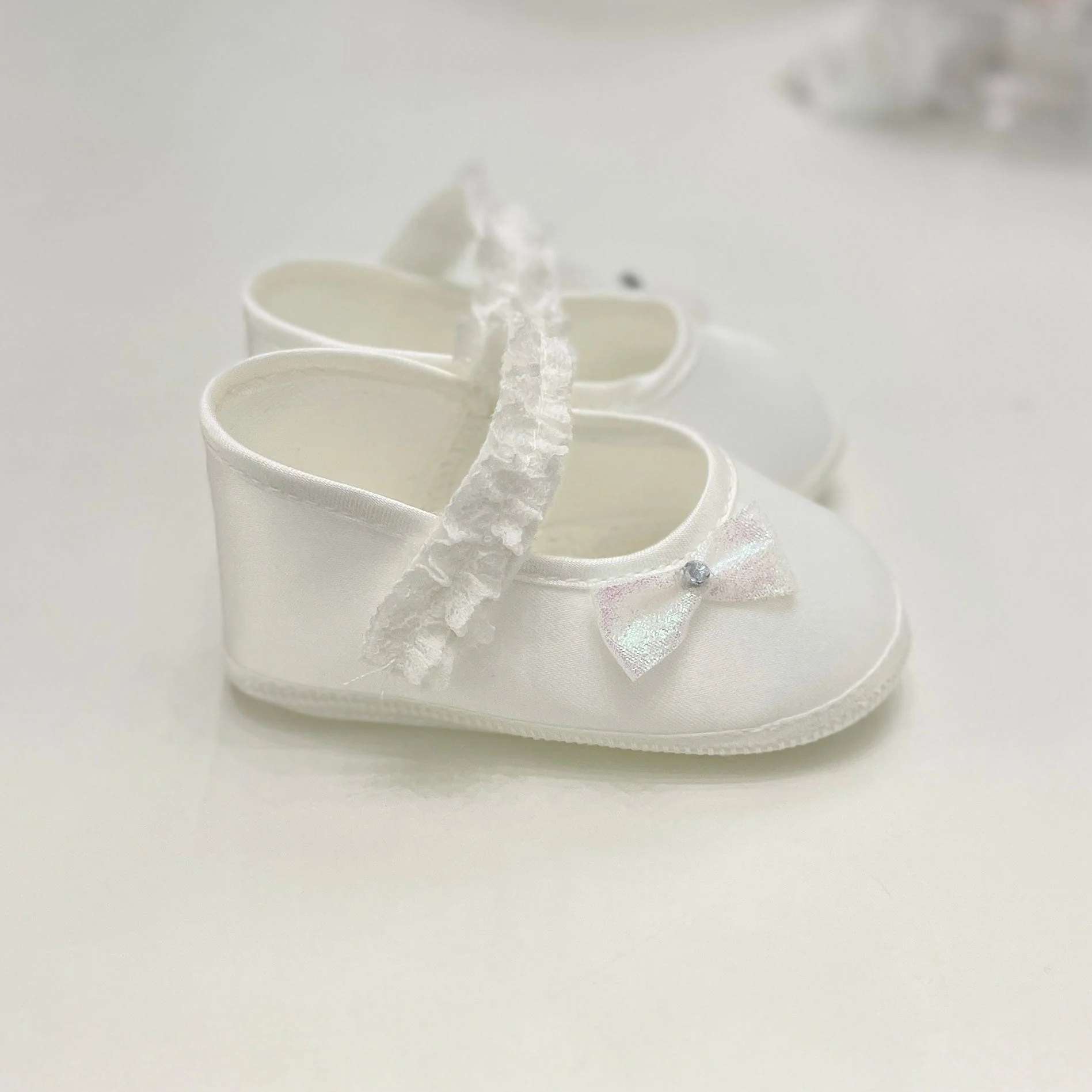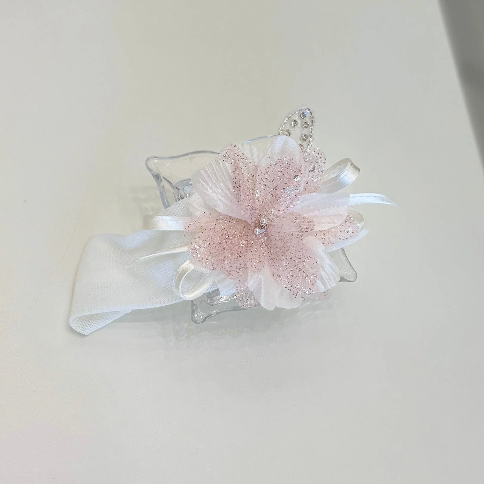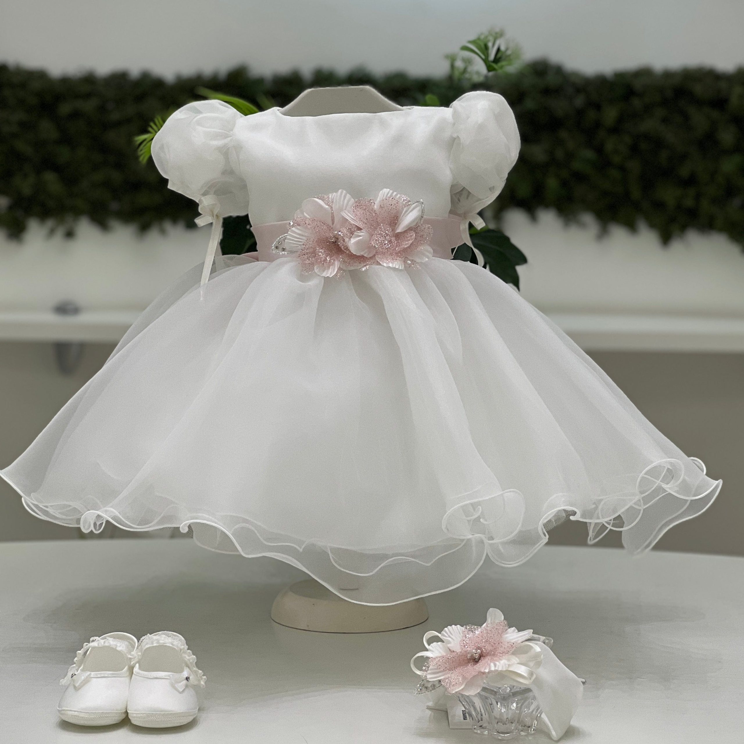 Abito battesimale in organza, caratterizzato da maniche a sbuffo impreziosite da piccoli fiocchetti che aggiungono un tocco di dolcezza. La cintura in vita rosa esalta la silhouette, completata da un’elegante applique floreale glitterato con punti luce che conferiscono brillantezza e raffinatezza. Un abito ideale per celebrare il battesimo con grazia e stile, perfetto per un’occasione speciale.