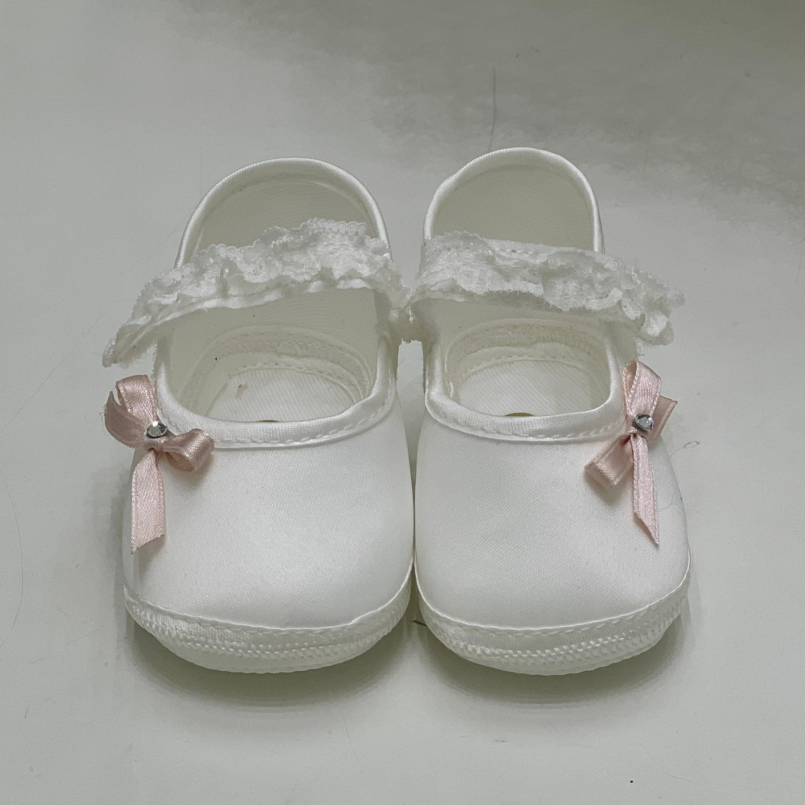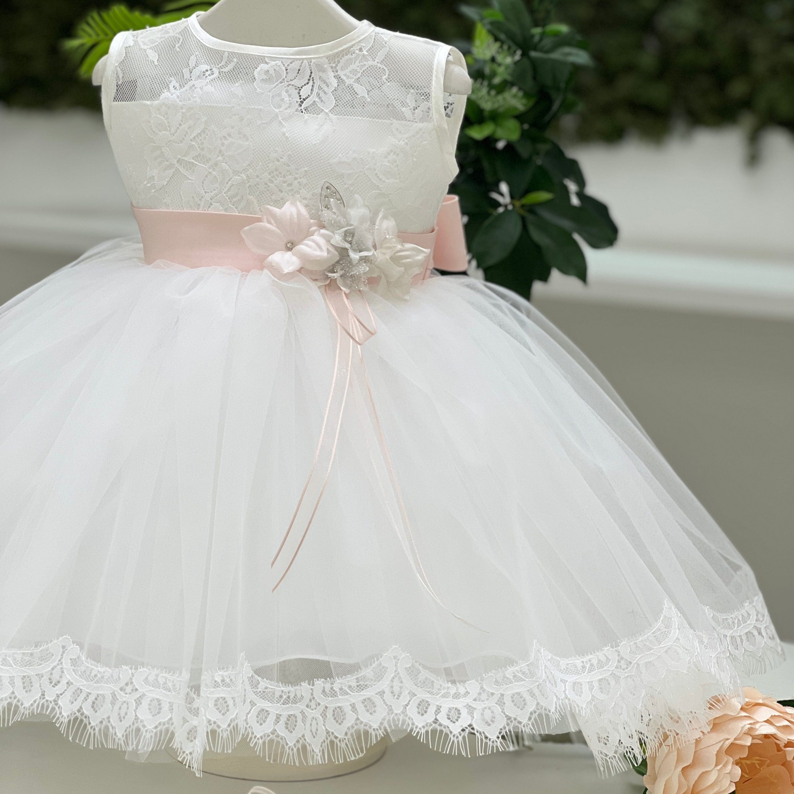 Abito battesimale composto da una gonna in tulle bordata in pizzo Chantilly e un corpetto rivestito nello stesso prezioso pizzo, con manica a giro. La cintura in vita, in delicata tonalità cipria, è arricchita da un dettaglio floreale e luminosi punti luce. Un modello che incanta per la sua eleganza e raffinatezza, perfetto per un battesimo speciale.