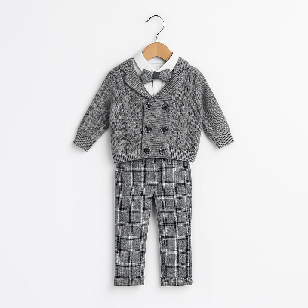 Completo elegante per neonato composto da camicia con colletto classico e papillon coordinato, cardigan doppiopetto in maglia con intrecci laterali e pantaloni a quadri in tonalità grigio. Un insieme raffinato, strutturato con cura e pensato per cerimonie e momenti speciali con un’eleganza intramontabile.