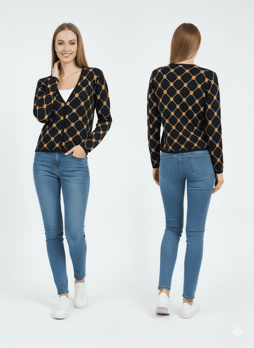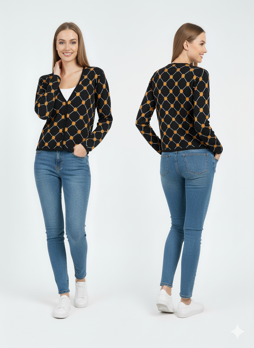 Il disegno geometrico, arricchito da tocchi ocra caldi e morbidi, crea un contrasto raffinato con il nero, donando luce al viso e profondità all’outfit senza risultare eccessivo. È una maglia pensata per chi ama l’eleganza naturale, non urlata.