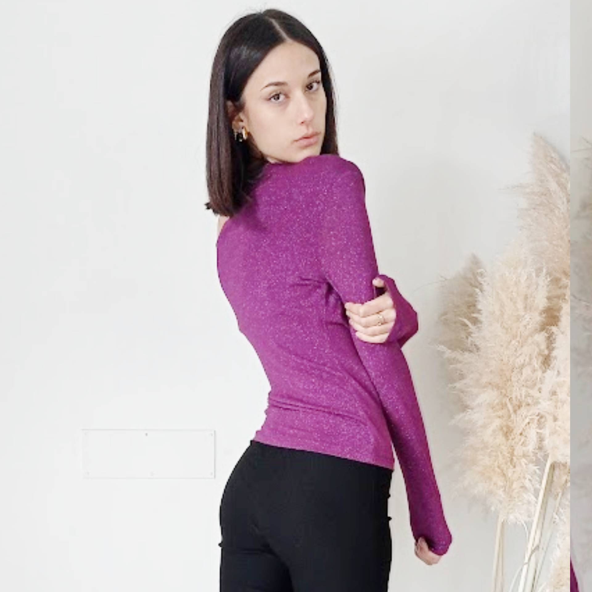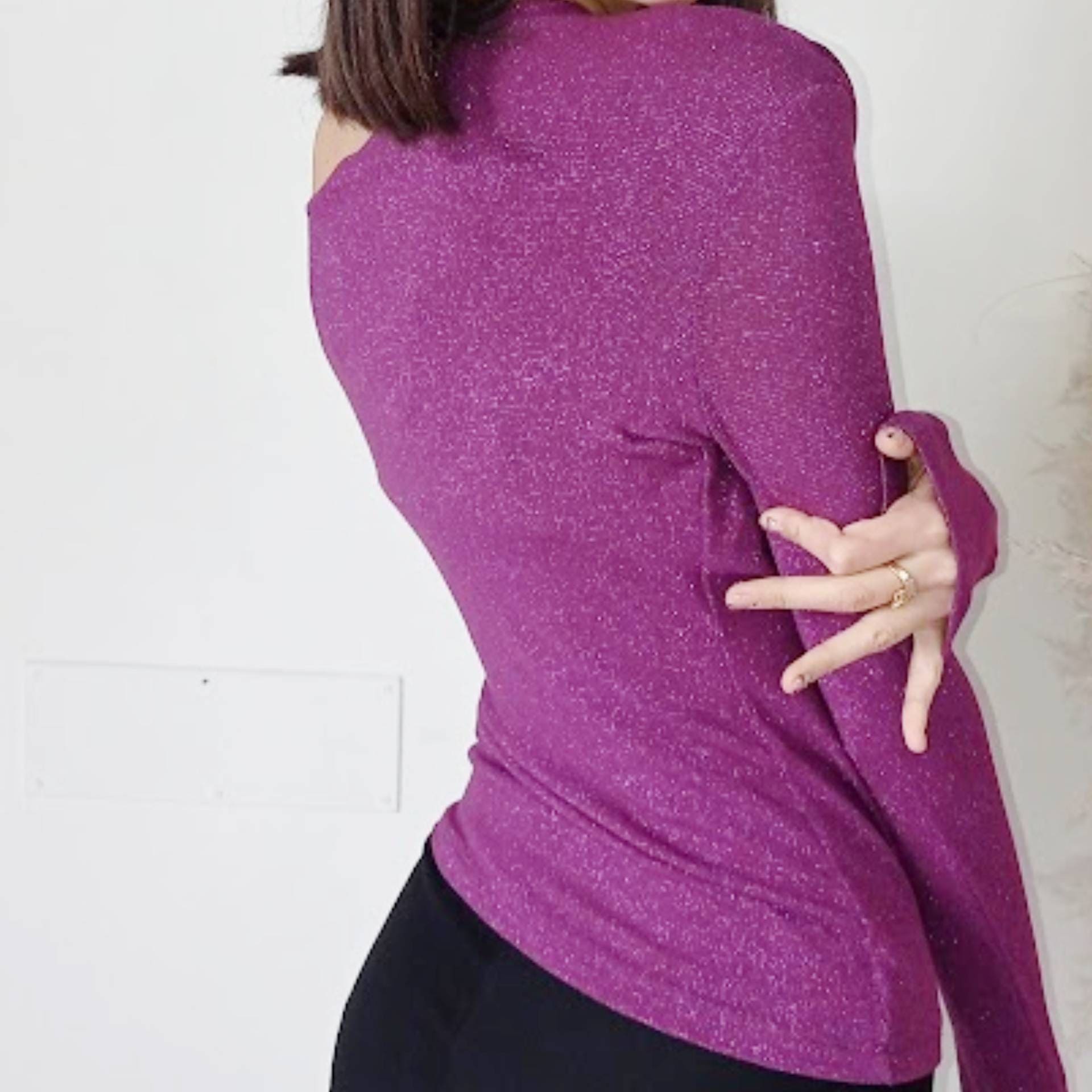 Questa maglia è la soluzione ideale per chi cerca un capo versatile che sappia passare con facilità dal casual al raffinato. Perfetta da indossare con un paio di jeans per un look da giorno o abbinata a un pantalone nero elegante per la sera. Il dettaglio della spalla scoperta ti permette di distinguerti con classe e sensualità, senza rinunciare alla comodità.