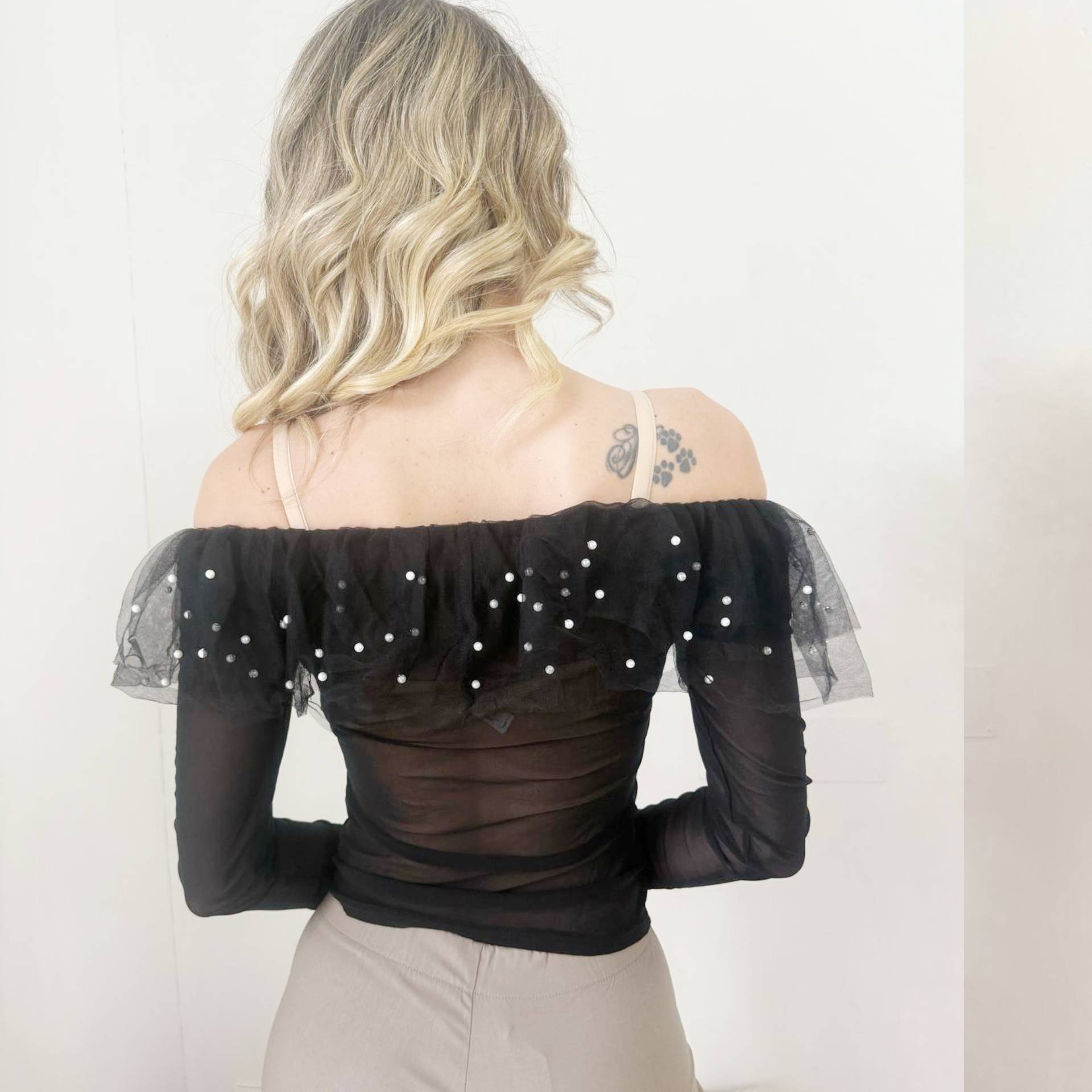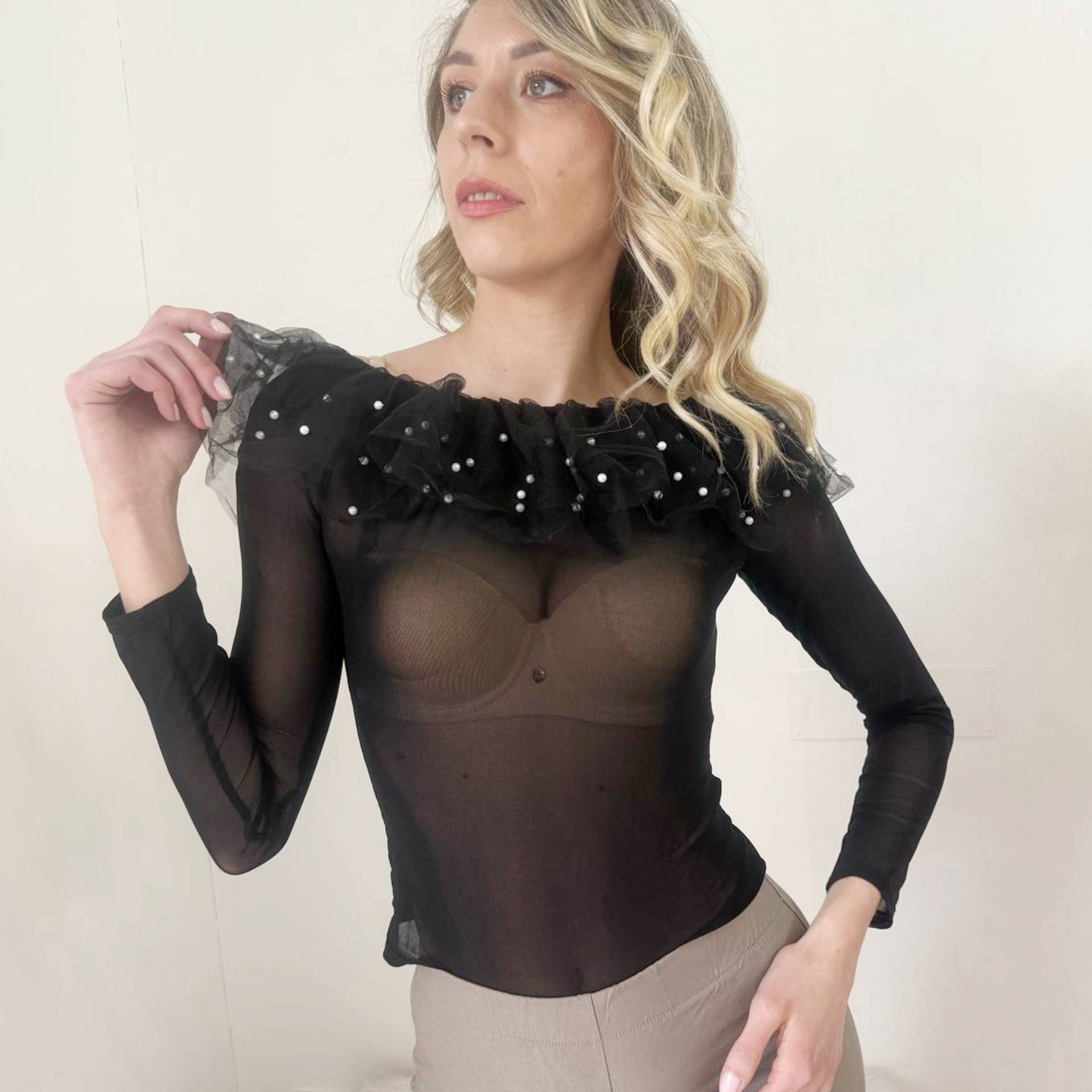 Maglia in tulle nera con volant con perle: il must-have che rivoluziona il tuo stile
