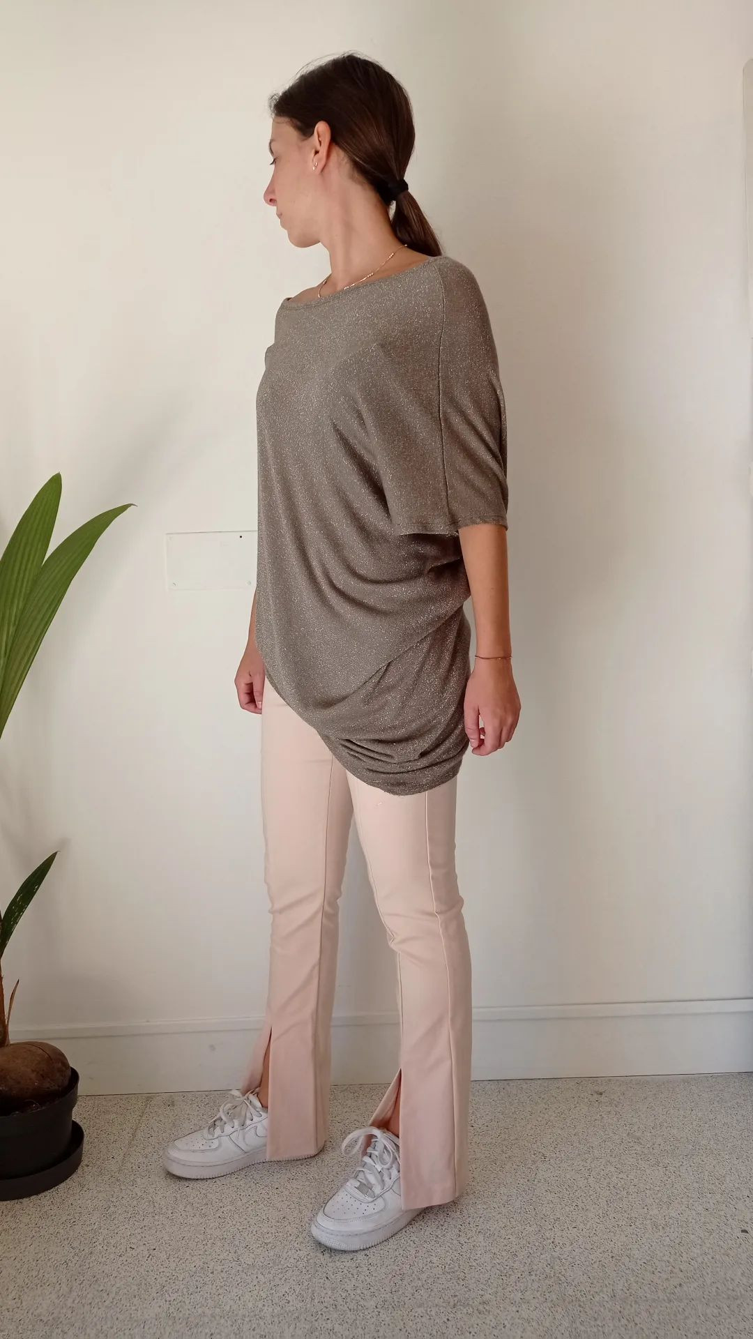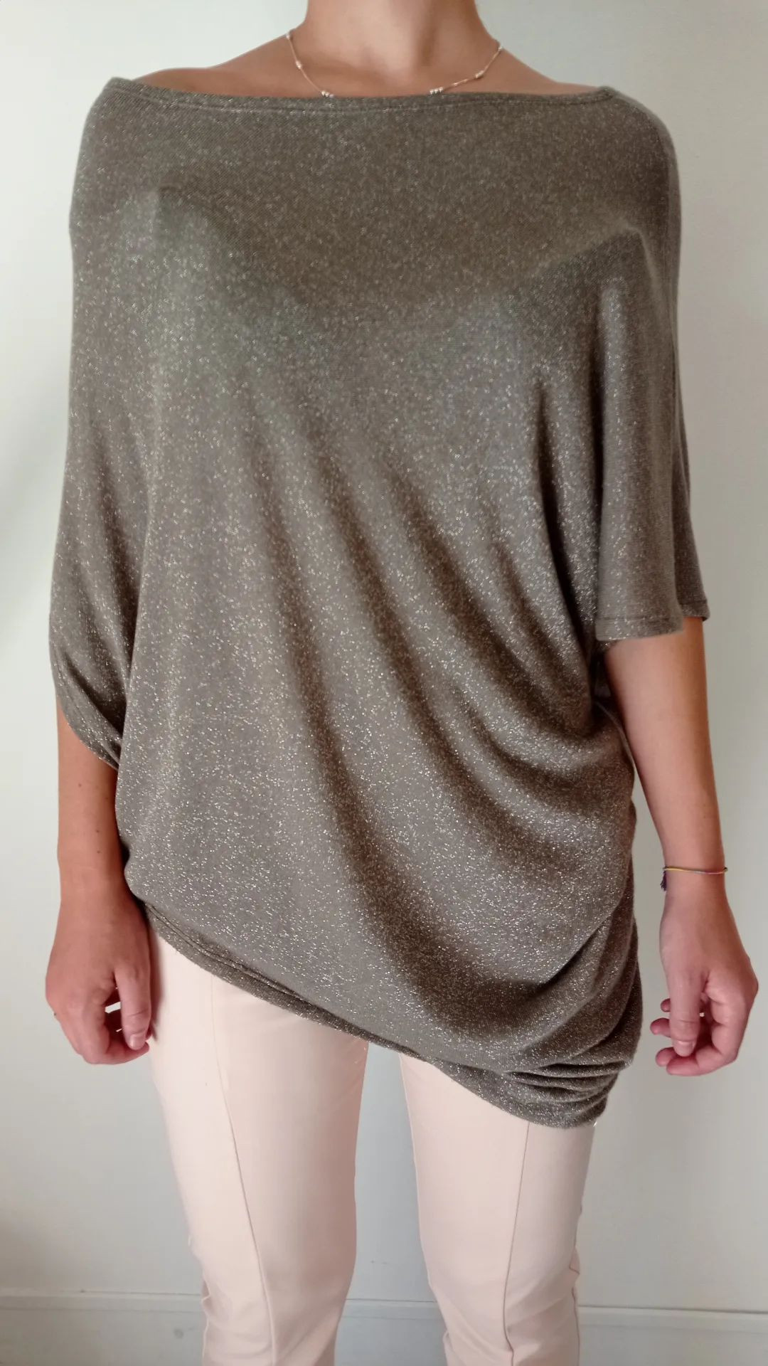 Tessuto lurex color tortora, taglio asimmetrico con un lato piu’ lungo e maniche scomposte.