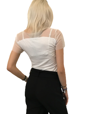 Perfetta come sottogiacca e’ perfetta anche da sola la maglia con spalla e manica in tulle.