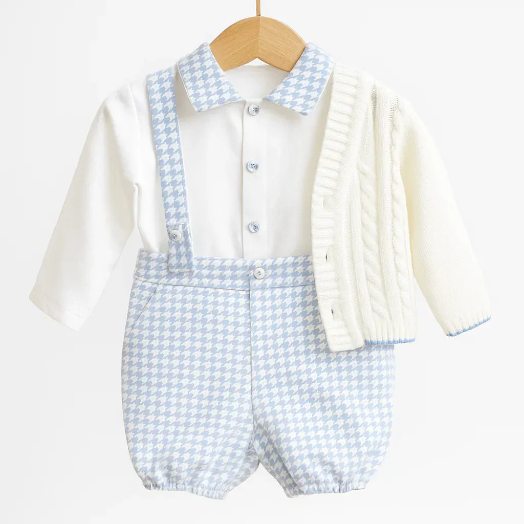Completo elegante per neonato composto da camicia bianca con colletto e bottoni celesti, abbinata a shorts con bretelle in fantasia pied-de-poule azzurro e bianco. Il look è completato da un cardigan panna in maglia, con lavorazione a trecce e profili a contrasto. Un insieme raffinato e delicato, perfetto per cerimonie e occasioni speciali.