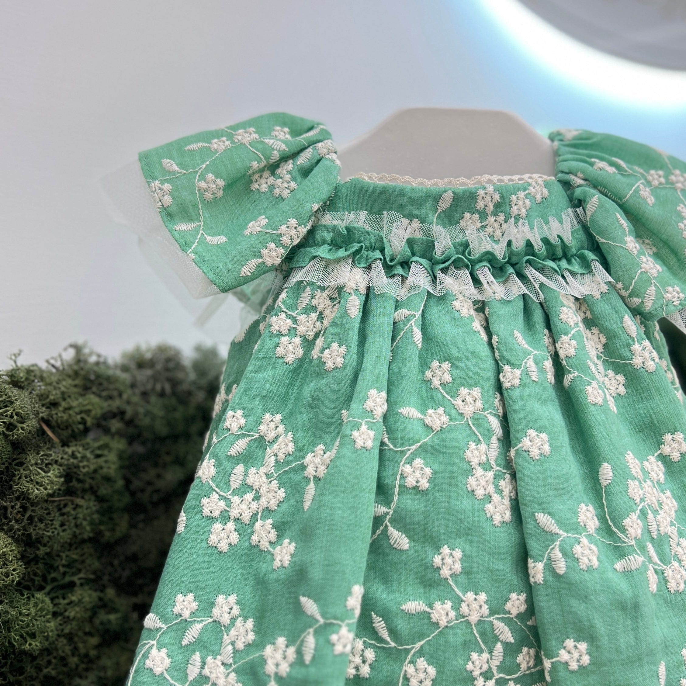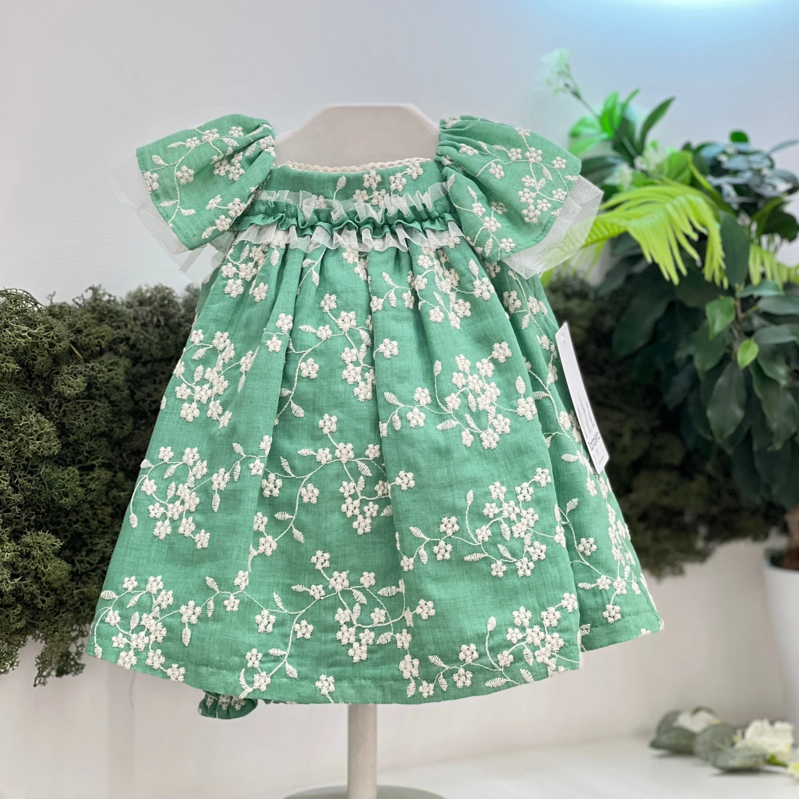 Abito con culotte in cotone con ricami floreali beige, manica ad aletta e abbottonatura sul retro con fiocco. Misto Cotonecod art: B6834V