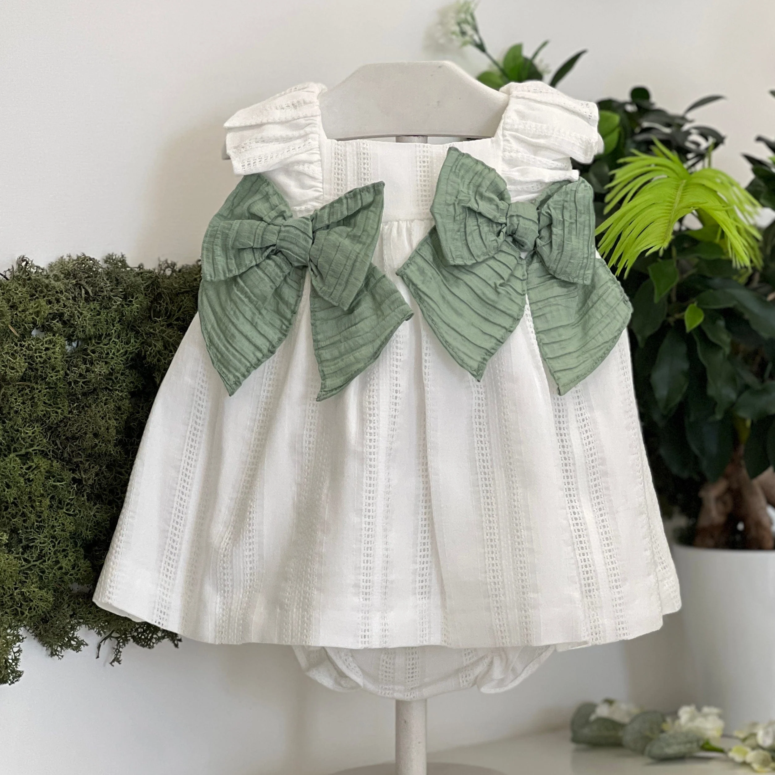 Abitino in cotone con culotte coordinata e fiocchi verdi a contrasto. Cotonecod art: 0327VER25