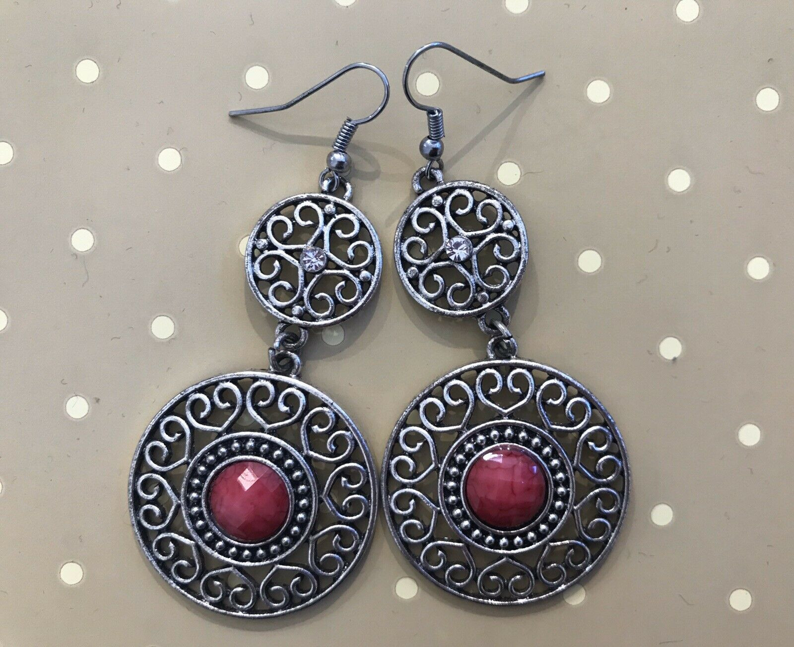 Orecchino lungo, con punto rosso.