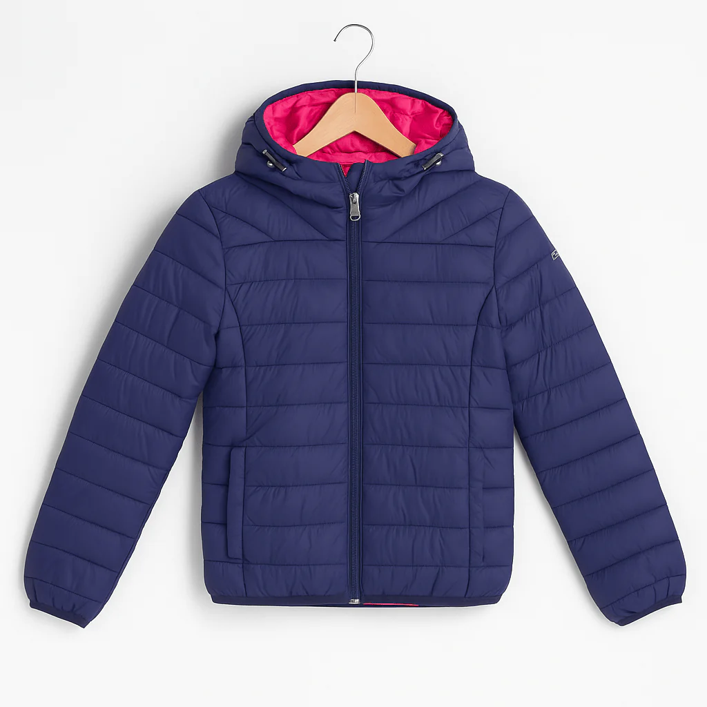 Piumino blu dal design essenziale, caratterizzato da una trapuntatura orizzontale e una linea asciutta che garantisce comfort e libertà di movimento. Il modello presenta cappuccio integrato con coulisse, chiusura con zip frontale e tasche laterali. L’interno a contrasto in fucsia aggiunge un tocco vivace e moderno. Perfetto per l’uso quotidiano, unisce praticità e stile in un capo leggero ma caldo.