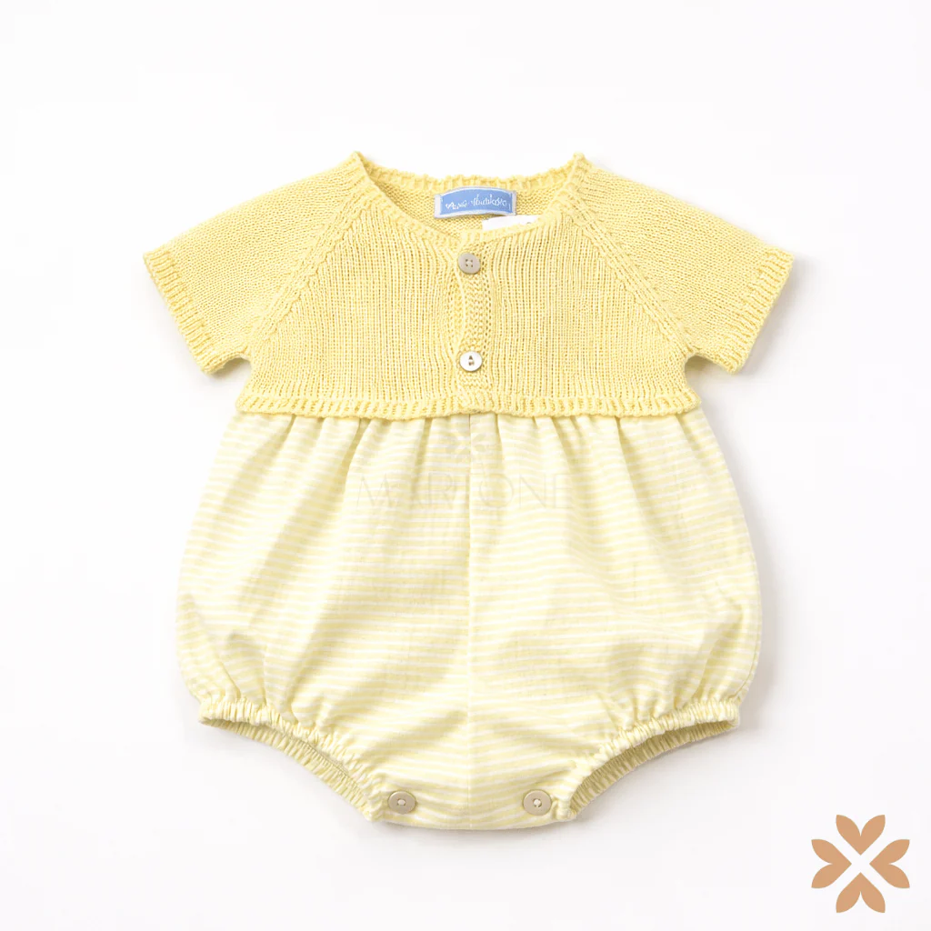Pagliaccetto in filo di cotone con parte superiore lavorata a maglia e pantaloncino a righe. Vestibilità morbida e curata nei dettagli. Chiusura con bottoni frontali e sul fondo. comp: cotone/acrilicocod art: 0016/limonata