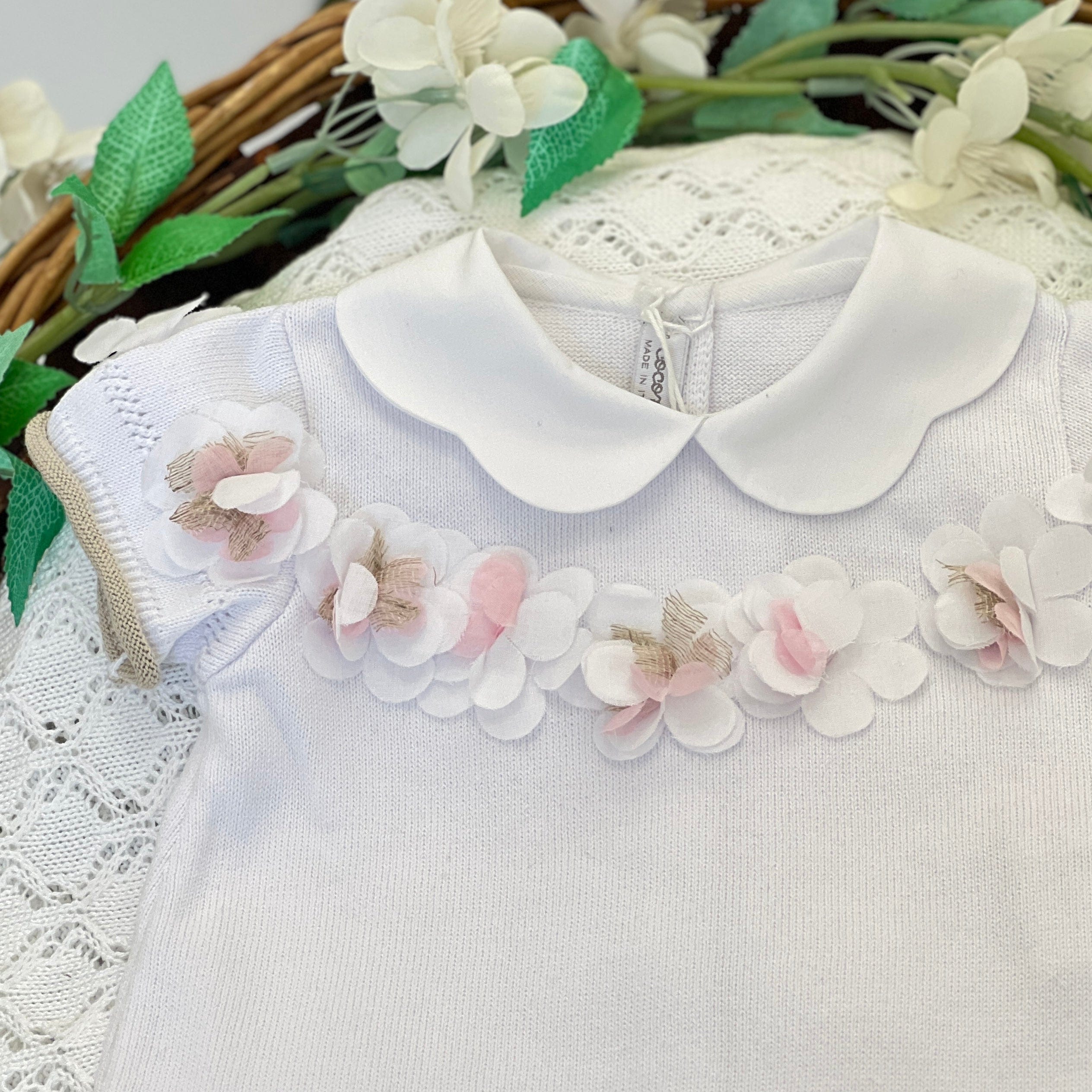 Pagliaccetto corto in filo di cotone, arricchito da ricami in punto a giorno e fiori tridimensionali, con colletto smerlato.