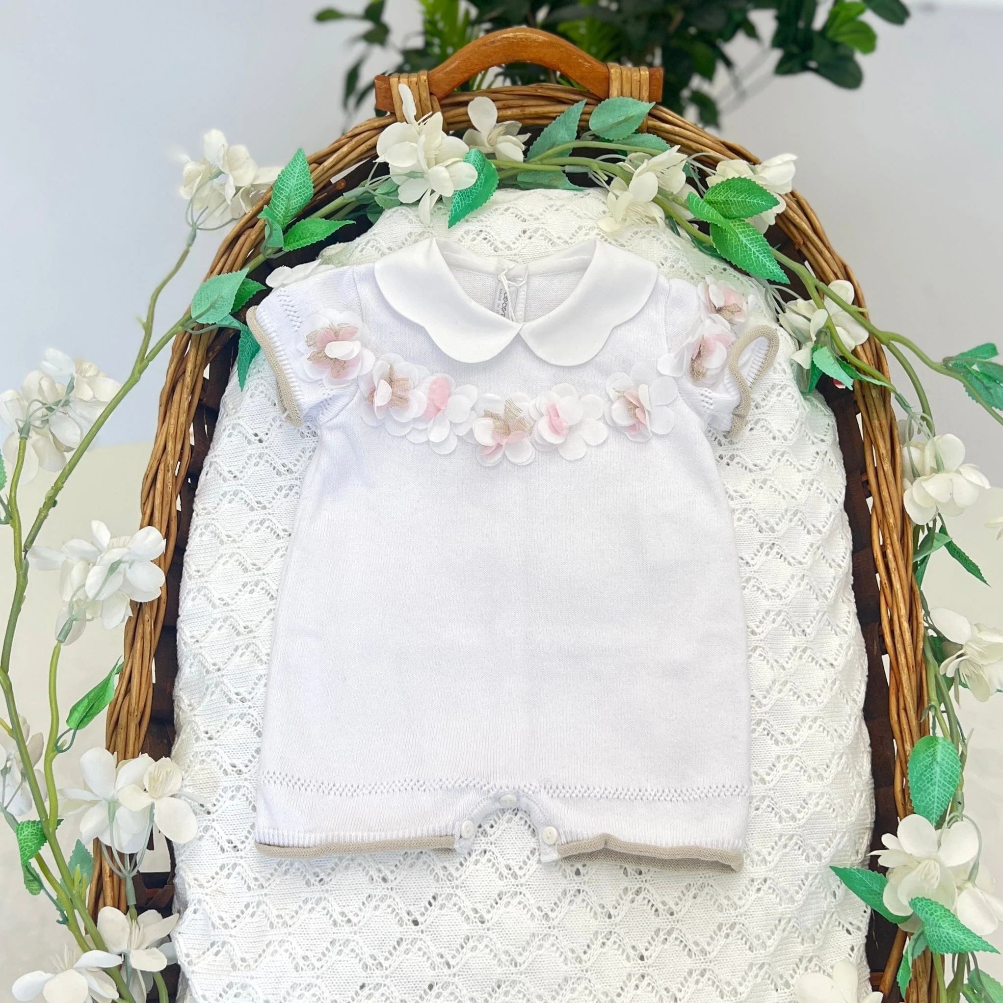 Pagliaccetto corto in filo di cotone, arricchito da ricami in punto a giorno e fiori tridimensionali, con colletto smerlato. 100% cotonecod art: LCN2449