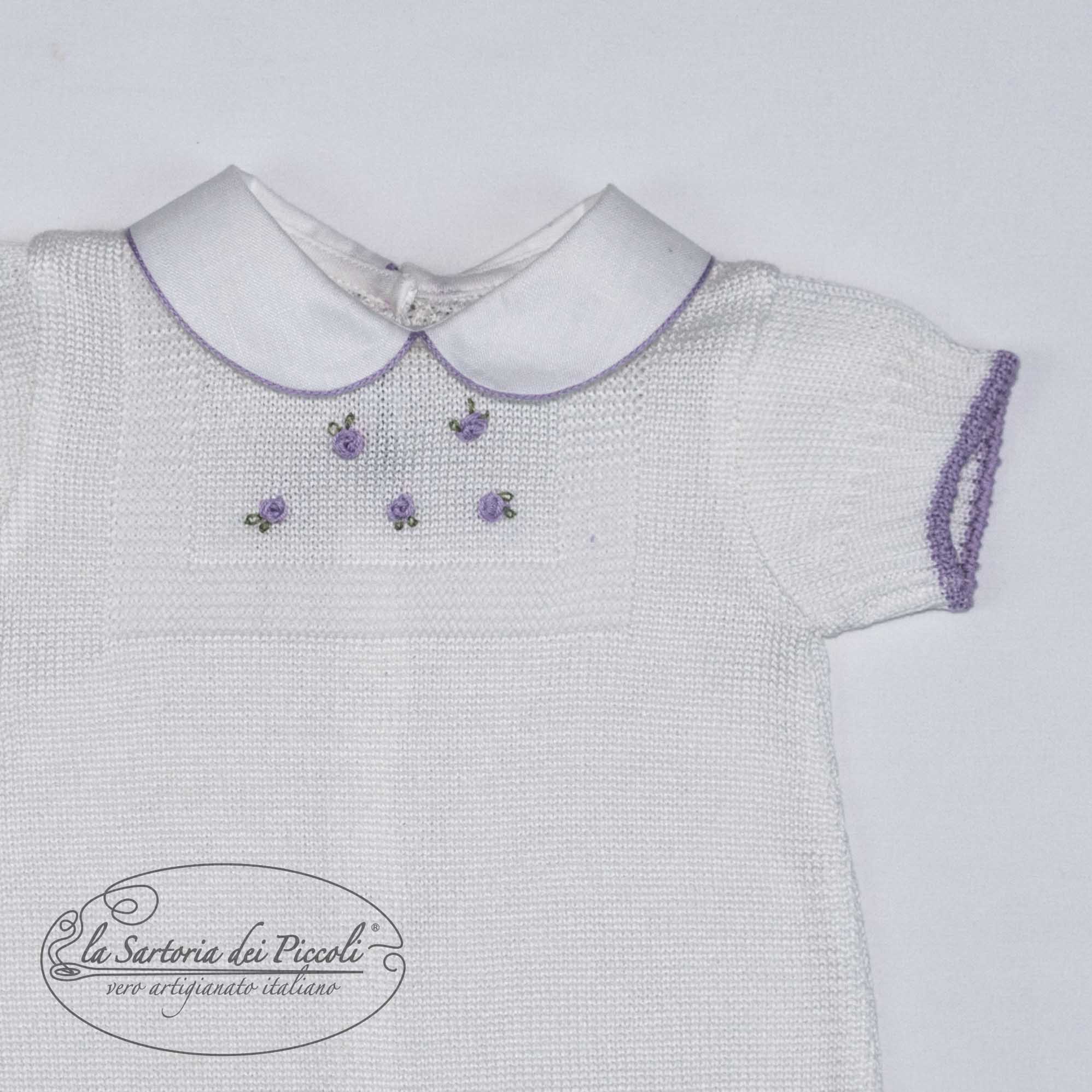 Pagliaccetto in filo di cotone bianco, impreziosito da roselline a vapore ricamate a mano nei toni del glicine. Un capo elegante e delicato, perfetto per le prime occasioni speciali della tua bambina. 100% cotonecod art: LP1006