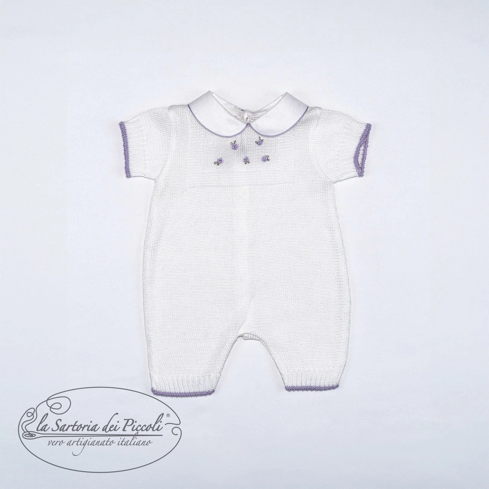 Pagliaccetto in filo di cotone bianco, impreziosito da roselline a vapore ricamate a mano nei toni del glicine. Un capo elegante e delicato, perfetto per le prime occasioni speciali della tua bambina.