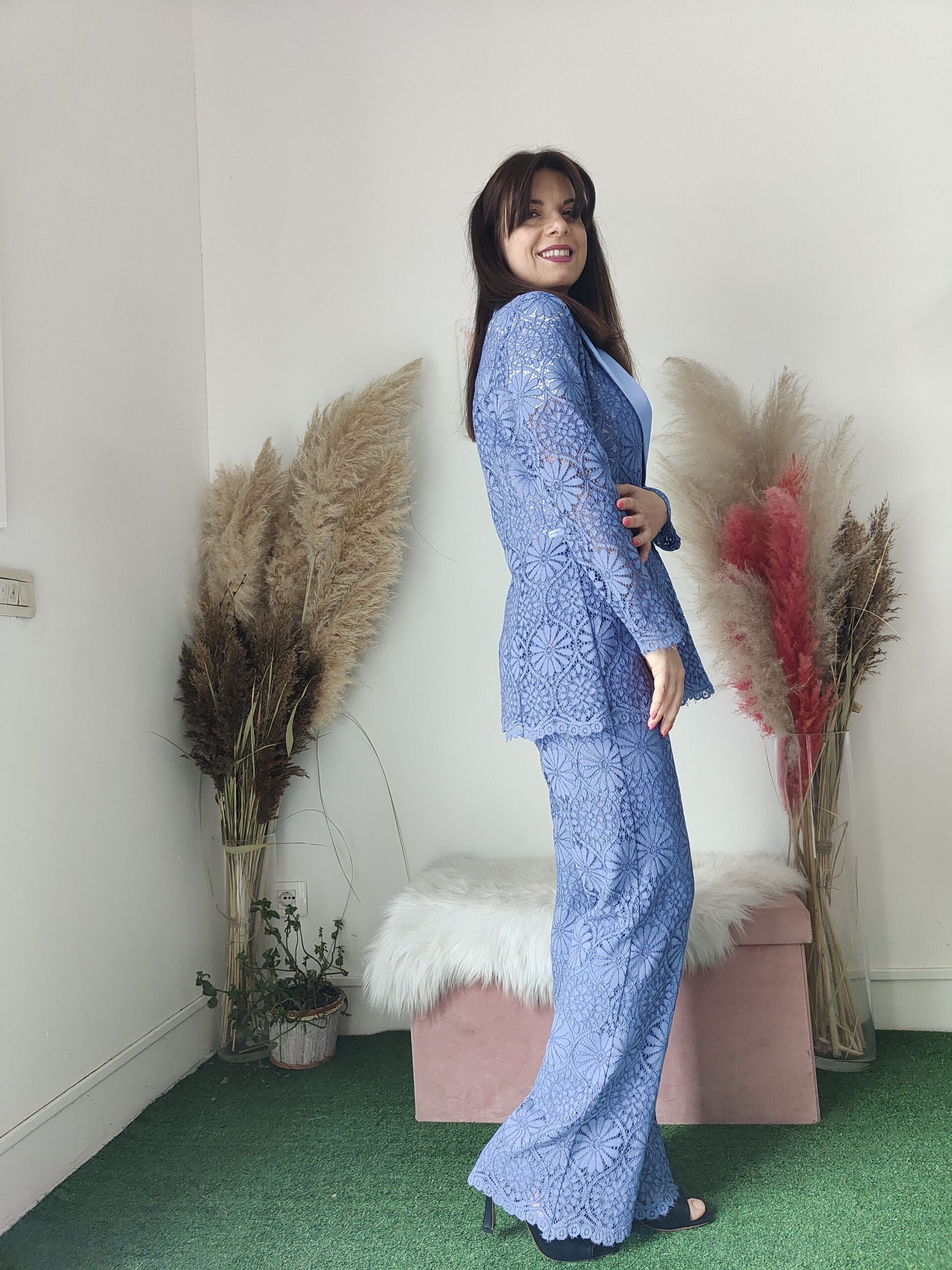 Se cerchi un pantalone che unisca stile, raffinatezza e comodità, hai trovato il capo perfetto. Il Pantalone Palazzo in Pizzo Pervinca è la sintesi ideale tra romanticismo e modernità, con un design che valorizza la silhouette senza rinunciare alla libertà di movimento. Il pizzo floreale intricato, unito alla delicatezza della tonalità azzurro pervinca, crea un effetto visivo straordinario, perfetto per ogni occasione in cui vuoi sentirti unica, elegante e impeccabile.