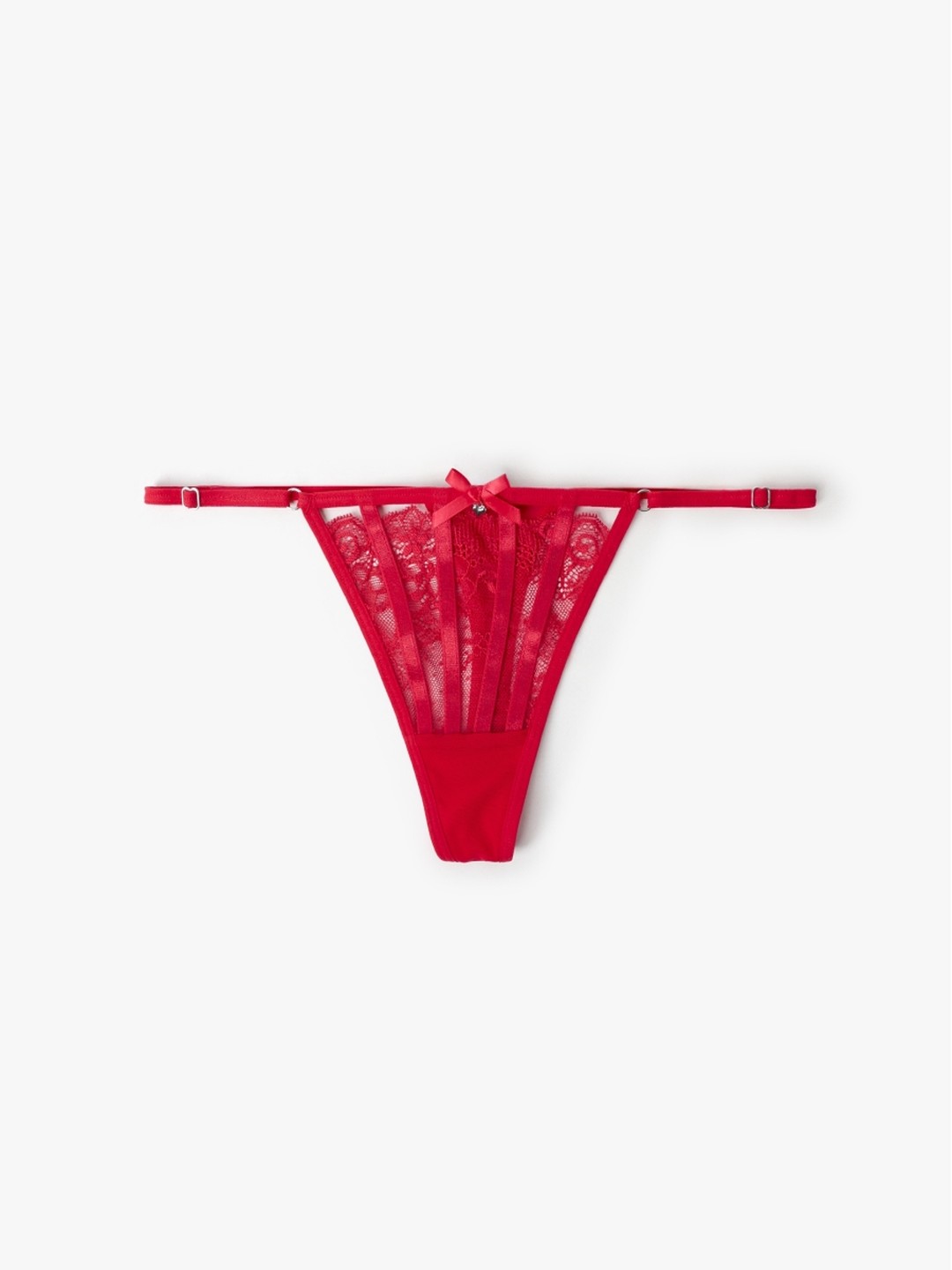 Perizoma da donna con eleganti dettagli in pizzo, disponibile in colore rosso e in due modelli: slip e perizoma. Realizzato in tessuto morbido al tatto per garantire comfort per tutto il giorno. Bordo elastico e delicato sulle gambe, non stringe e non segna la pelle. Presentato in una speciale confezione regalo con design personalizzato del marchio Admas. Design esclusivo Admas realizzato da Aznar Innova.