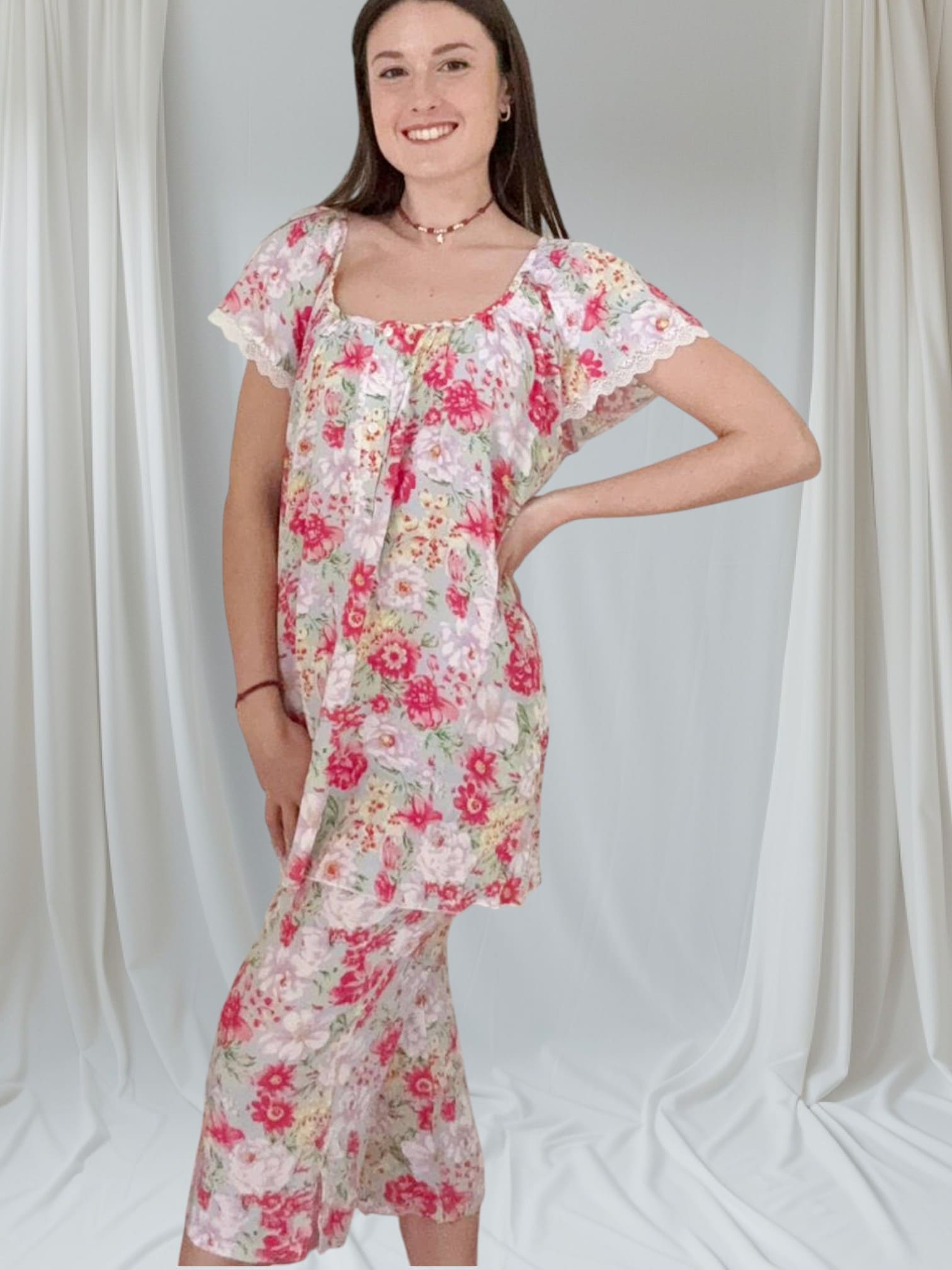 Pigiama estivo da donna in viscosa con fantasia floreale. Leggero, morbido e traspirante, con maniche ad aletta in pizzo. Disponibile nelle taglie S, M, L e XL