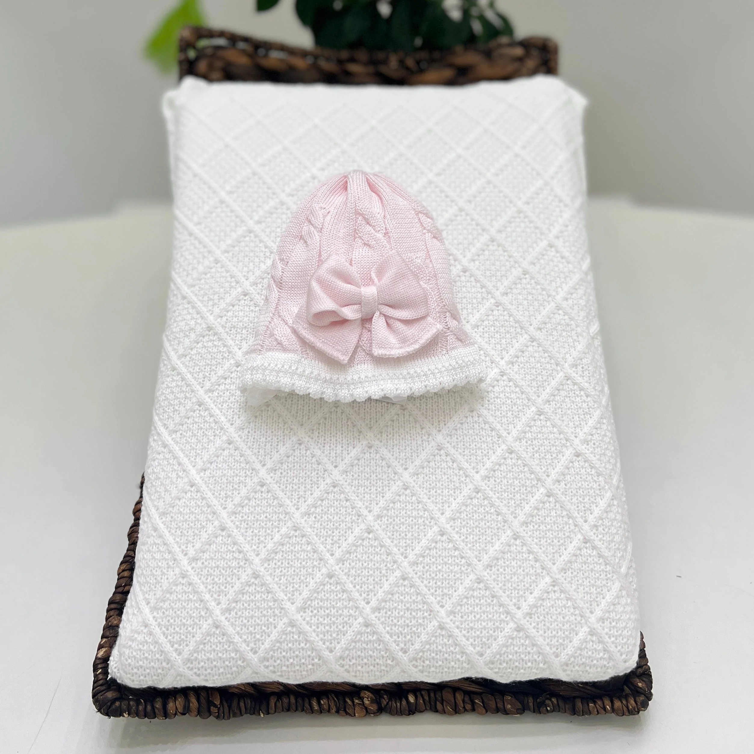 Cappellino per neonata in filo di cotone, con raffinata lavorazione intrecciata e fiocco applicato. Un accessorio delicato e sofisticato, ideale per aggiungere un tocco di eleganza al primo guardaroba. 100% puto cotone