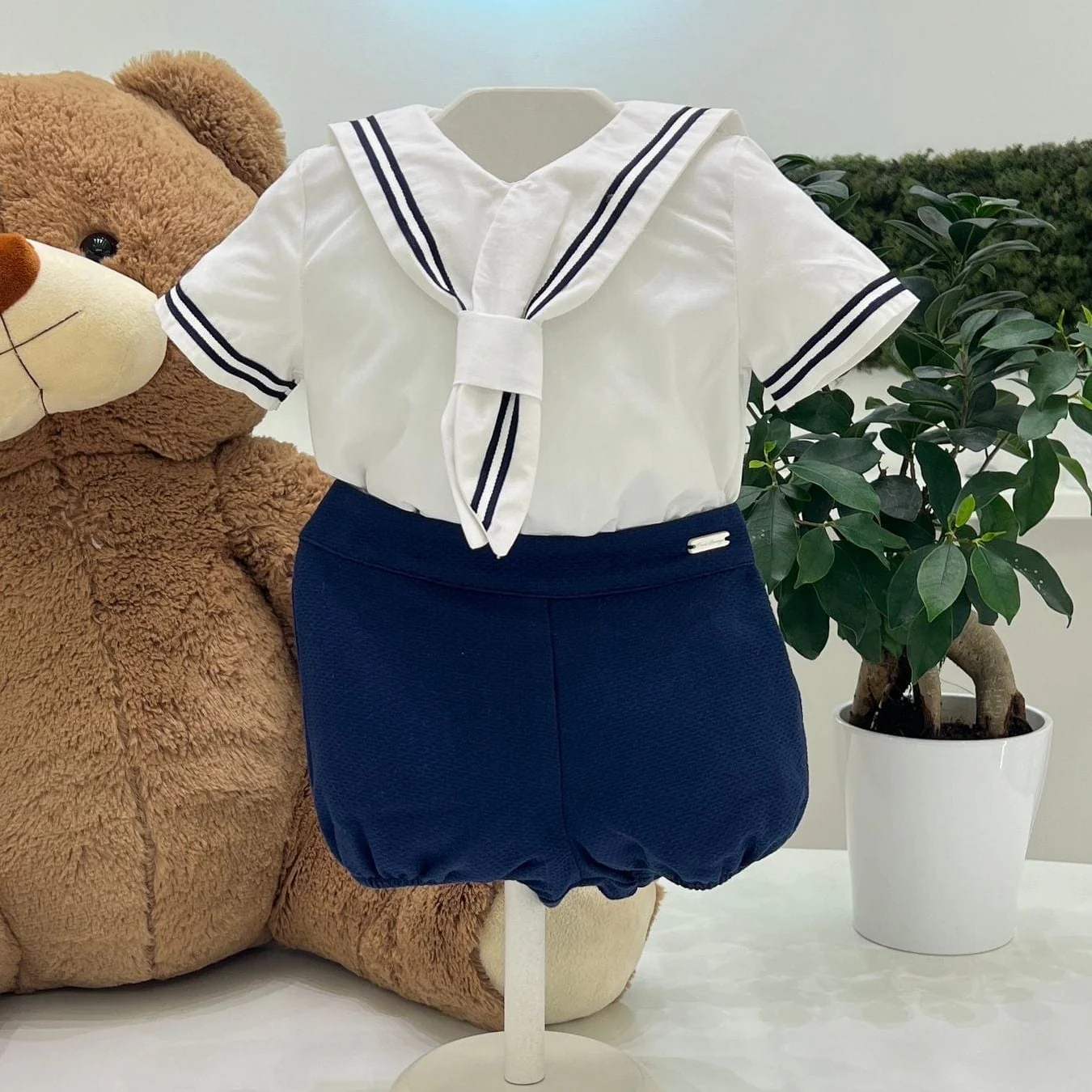 Completo neonato due pezzi con camicia con colletto in stile marinaro e pantaloncino microfantasia blu navy.