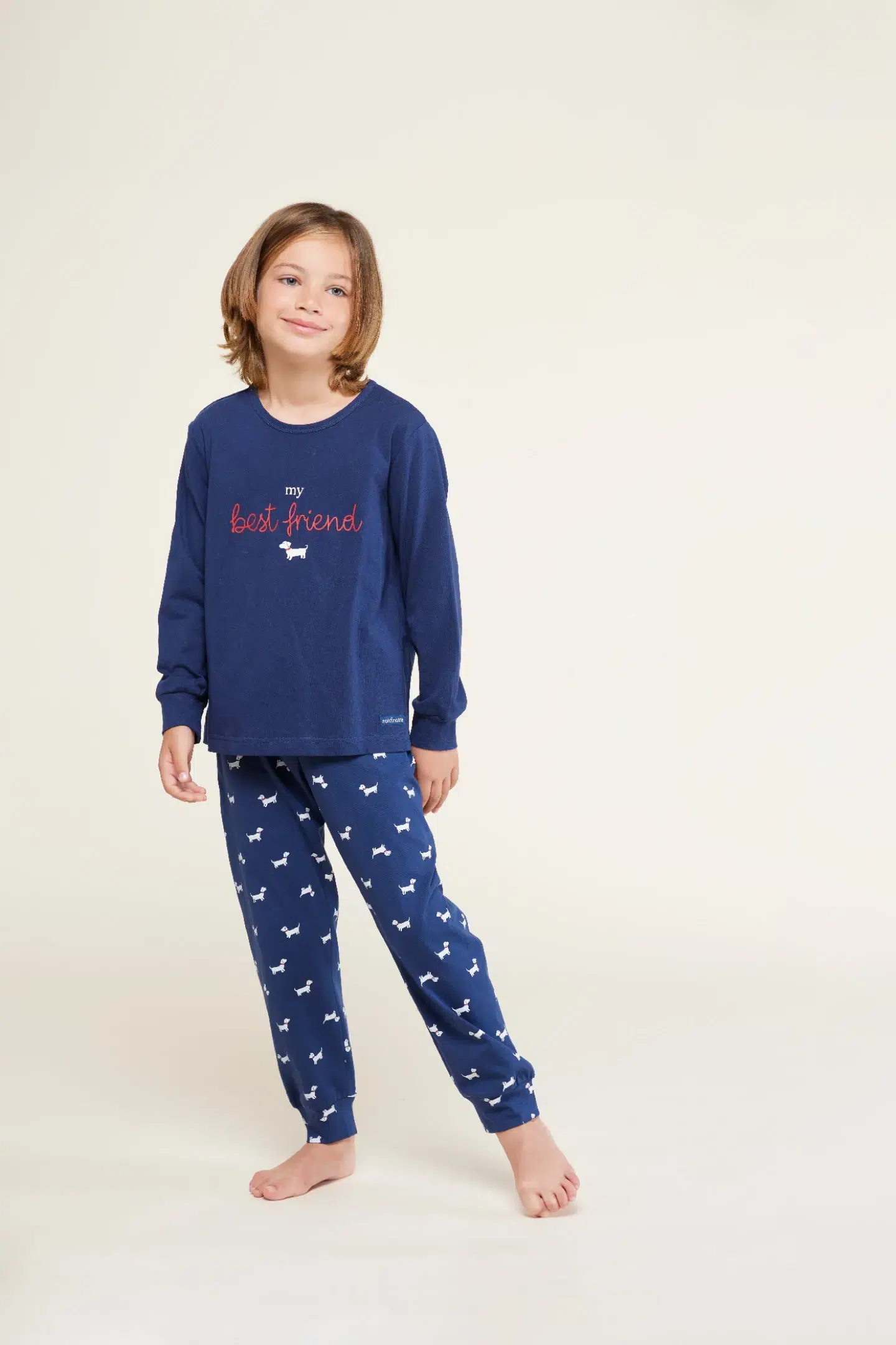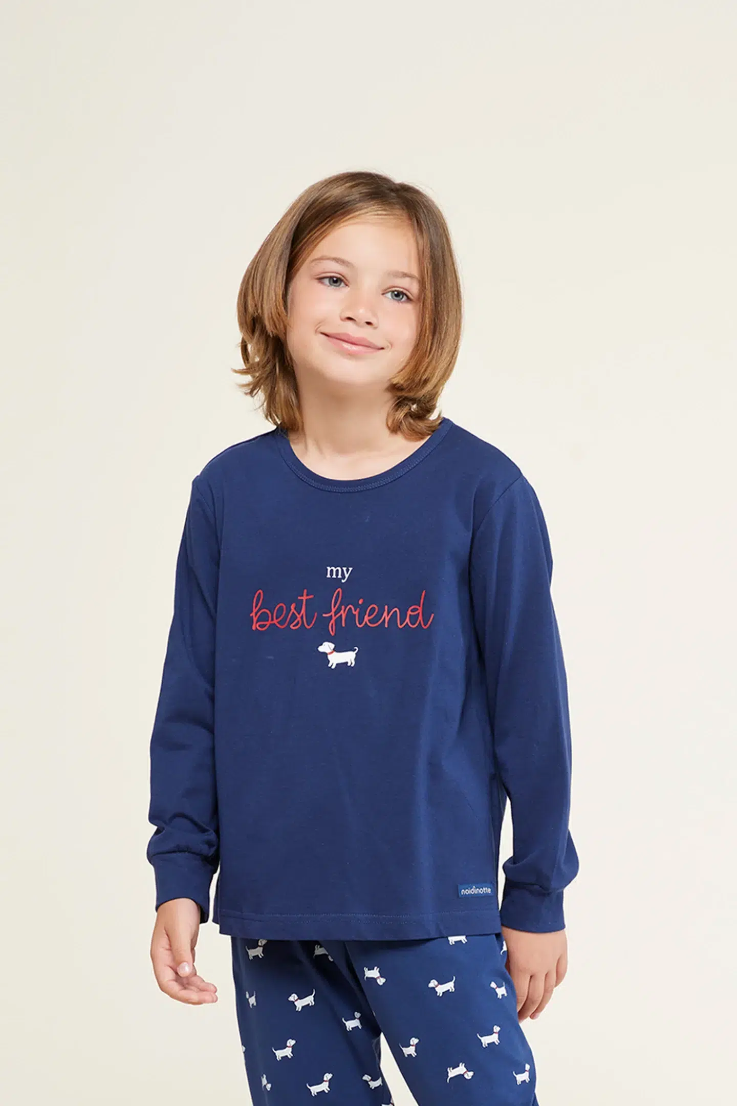 Pigiama bambino lungo cotone mini dog top manica lunga con polsini e stampa best friend centrale e pantalone lungo con polsini con stampa cagnolino all over