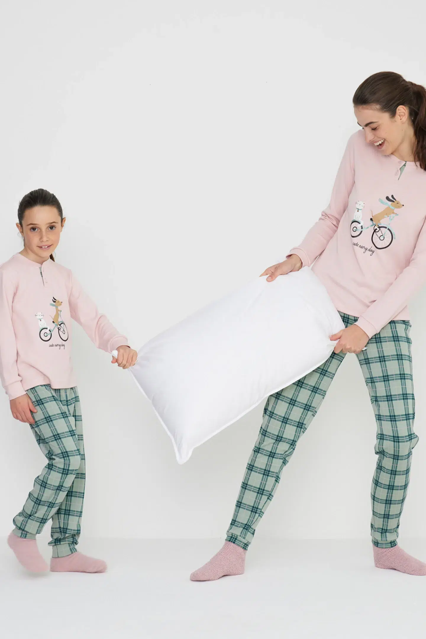 Pigiama bambina/o yuppie in morbido caldo cotone con collo due bottoni, top con simpatica stampa cagnolino e pantalone lungo con polsini in elegante stampa scozzese