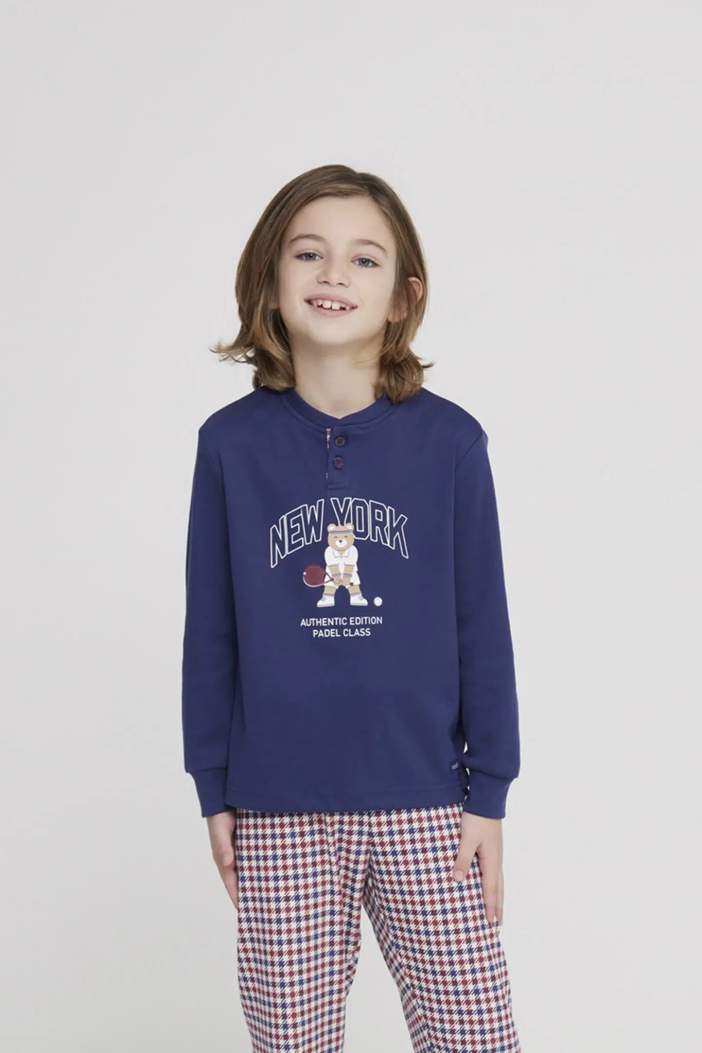 Pigiama bambino new york in morbido caldo cotone con collo due bottoni, top con dolce stampa orsetto e pantalone lungo in raffinata stampa pied de poule con comodi polsini