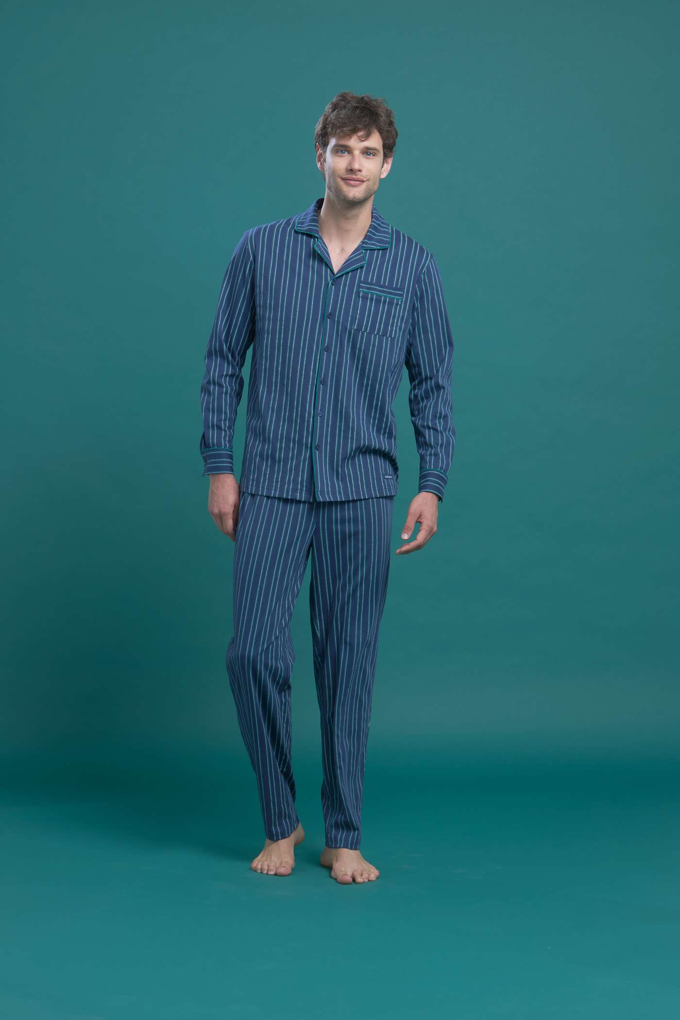 Pigiama uomo a righe top abbottonato manica lunga con profili a contrasto e pantalone lungo senza polsino