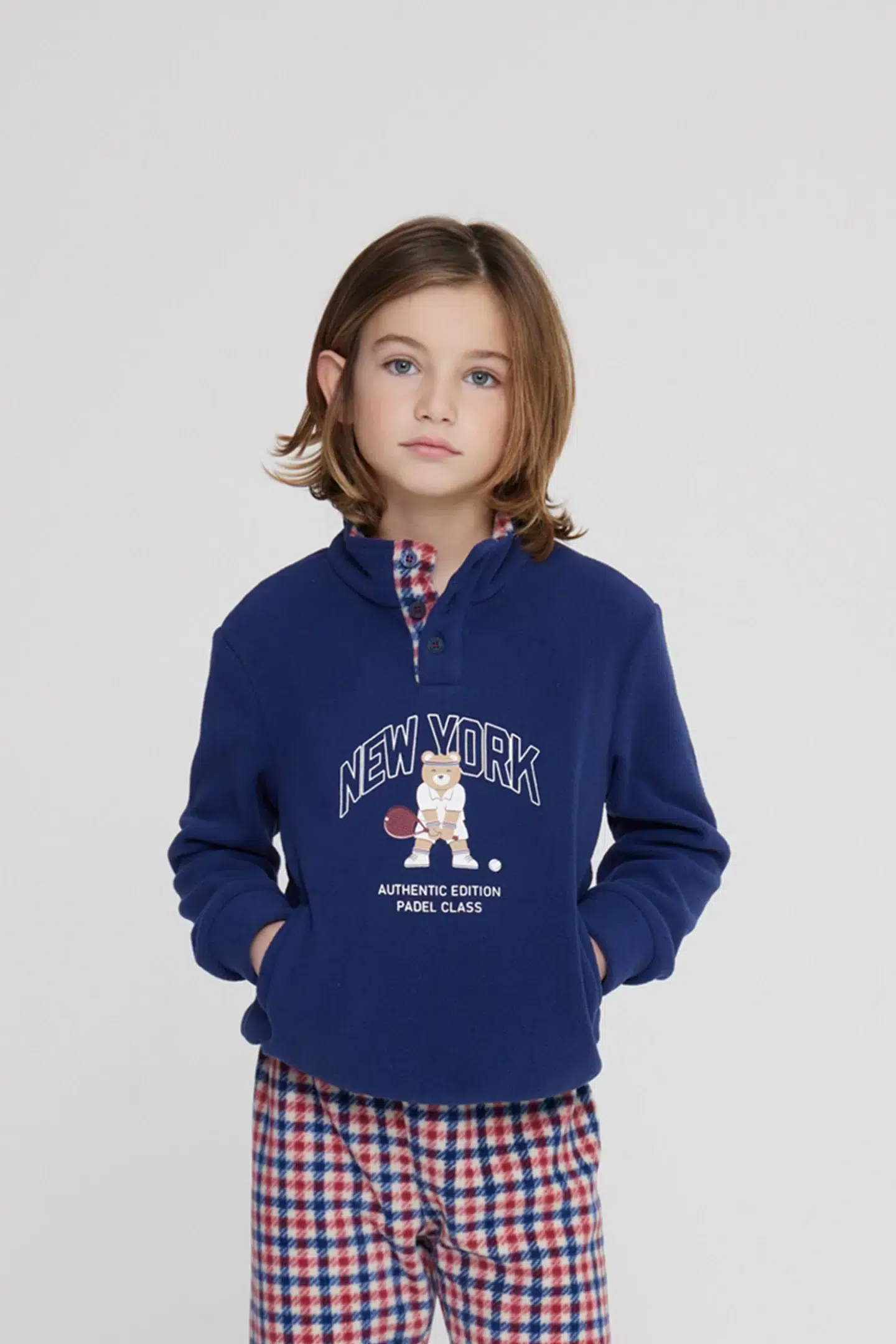 Pigiama bambino new york in pile con collo tre bottoni, top con dolce stampa orsetto e pantalone lungo in raffinata stampa pied de poule con comodi polsini