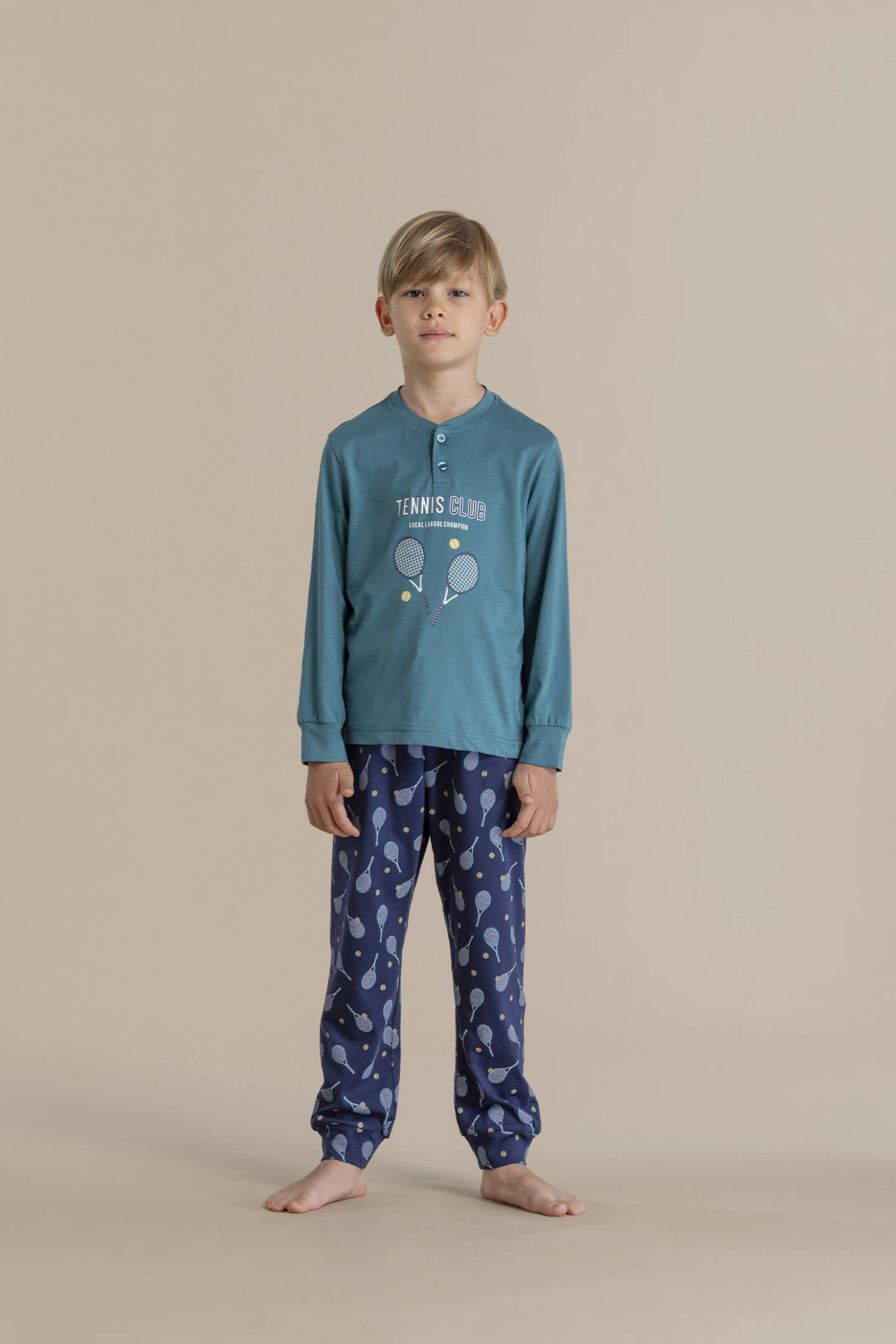 Pigiama bambino in 100% cotone top a manica lunga con collo due bottoni arricchito da una stampa coordinata. Il pantalone lungo con polsino presentano una vivace fantasia che dona un tocco di originalità.
