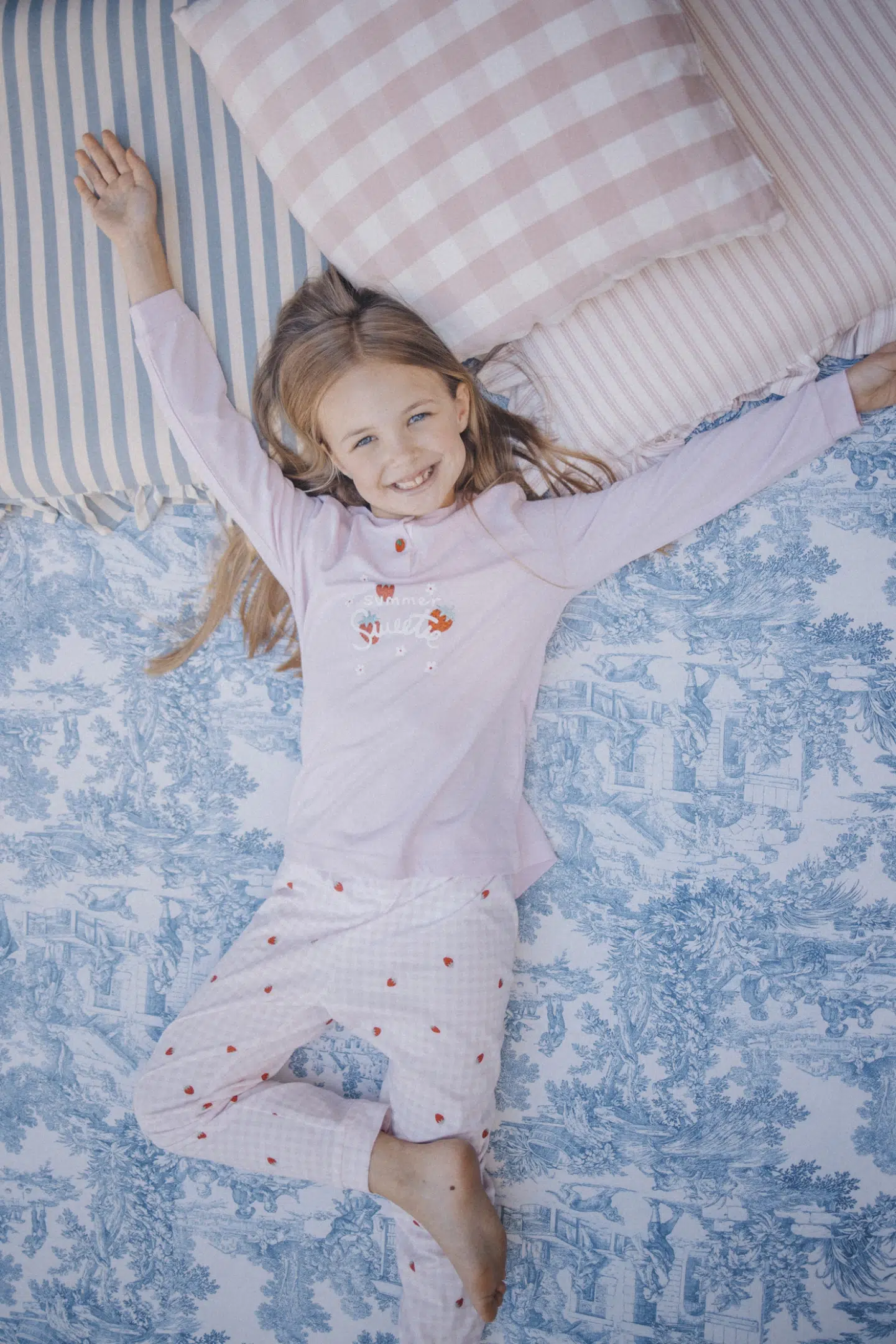 Pigiama bambina 100% cotone, con top a manica lunga e collo due bottoni decorato da una dolce stampa con fragole e scritta. I pantaloni lunghi con polsino presentano una fresca fantasia vichy rosa con dettagli di fragoline per un look vivace.