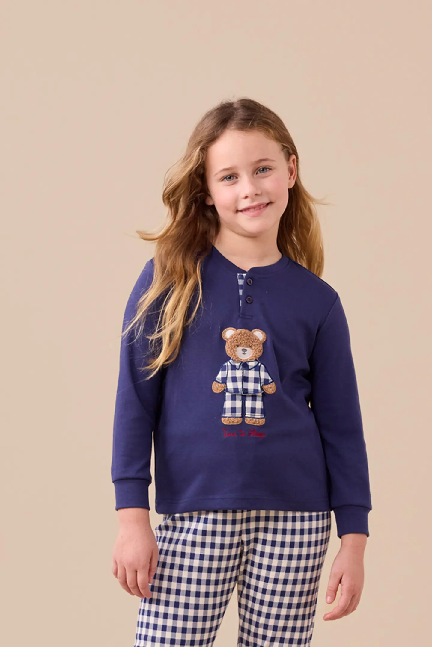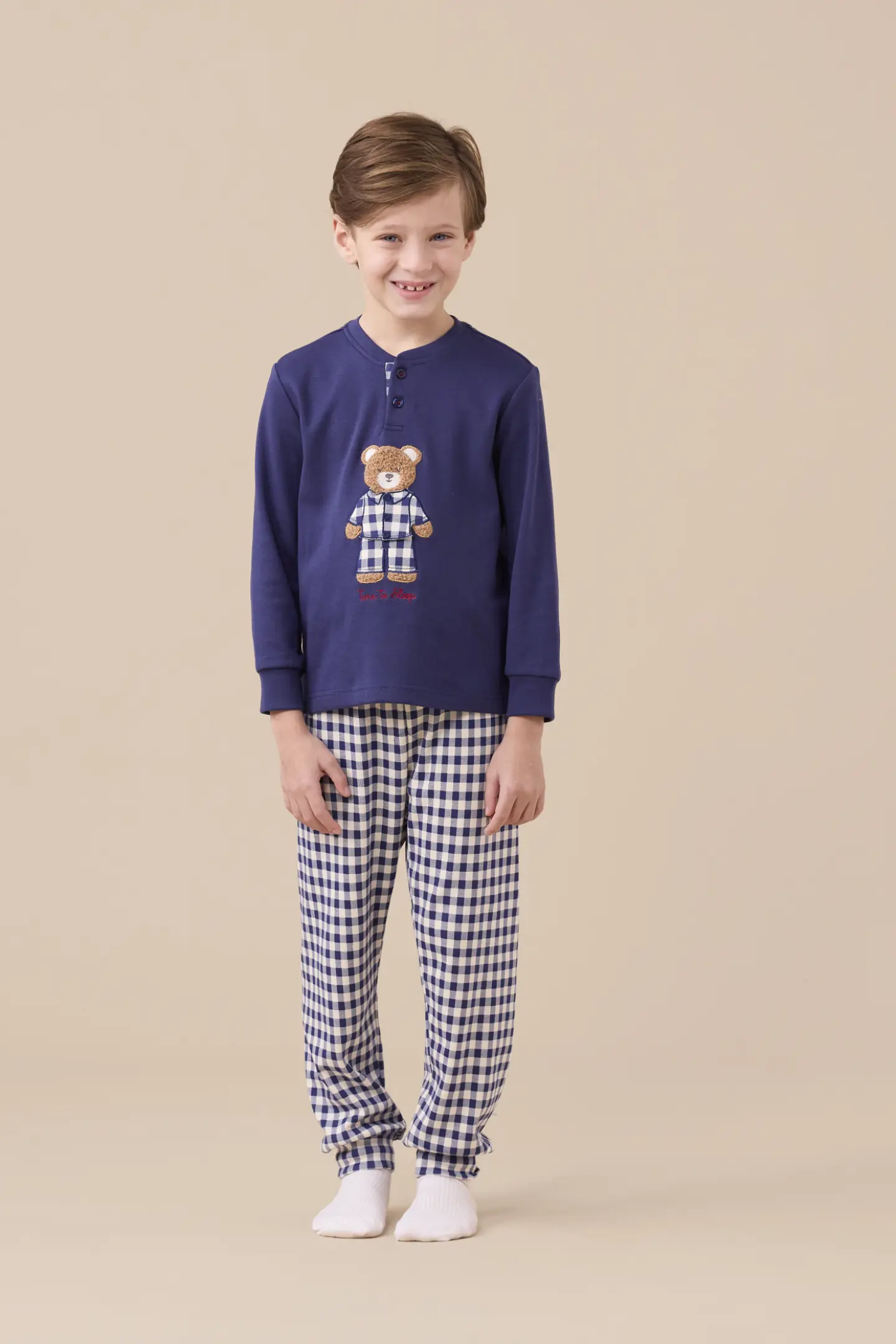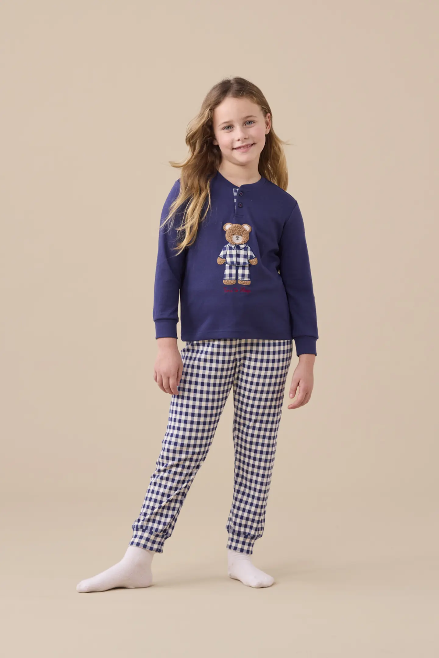 Pigiama bambina/o in caldo cotone con top unito con orso stampato. Pantaloni con stampa vichy blu con polsini.