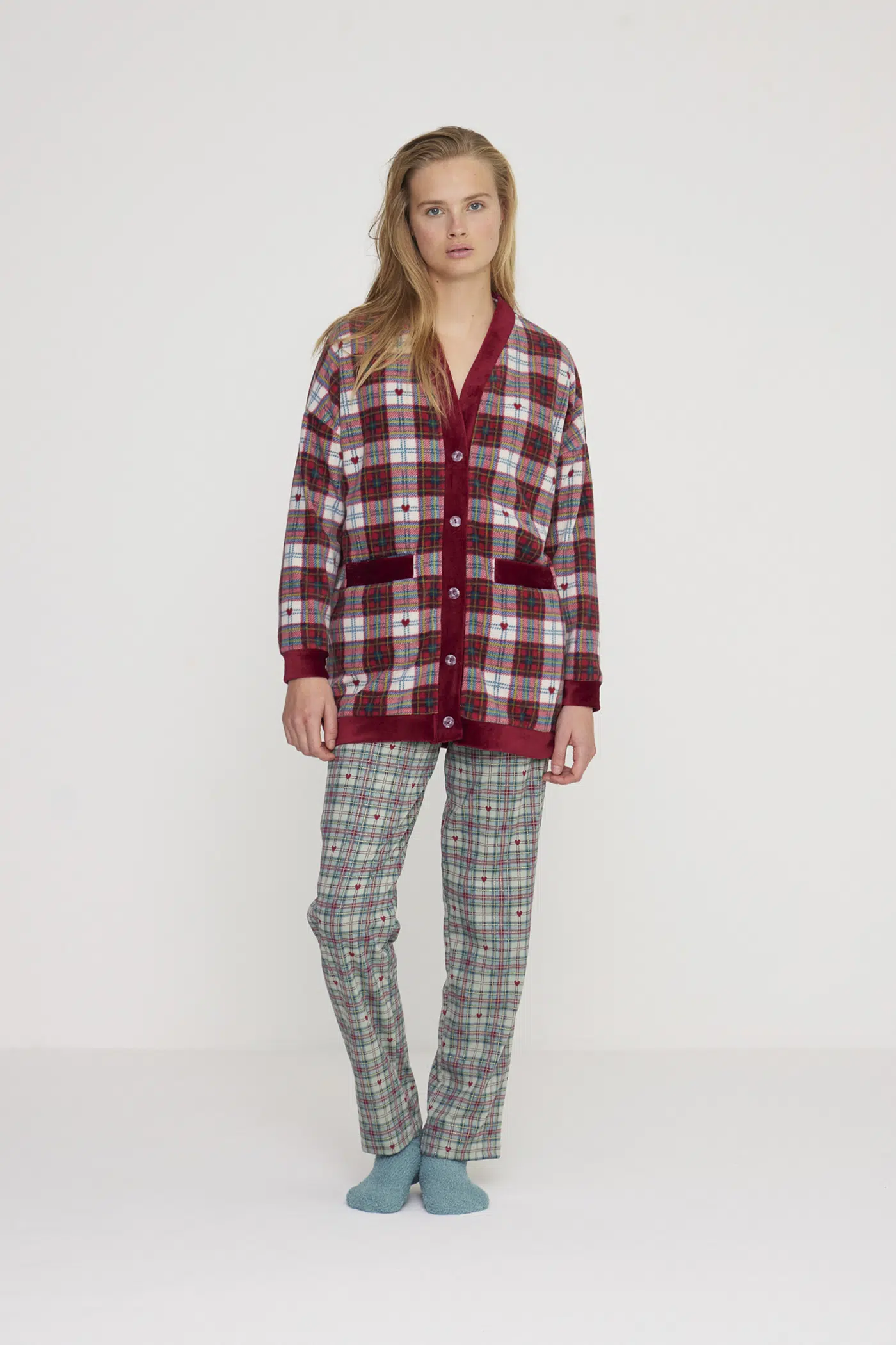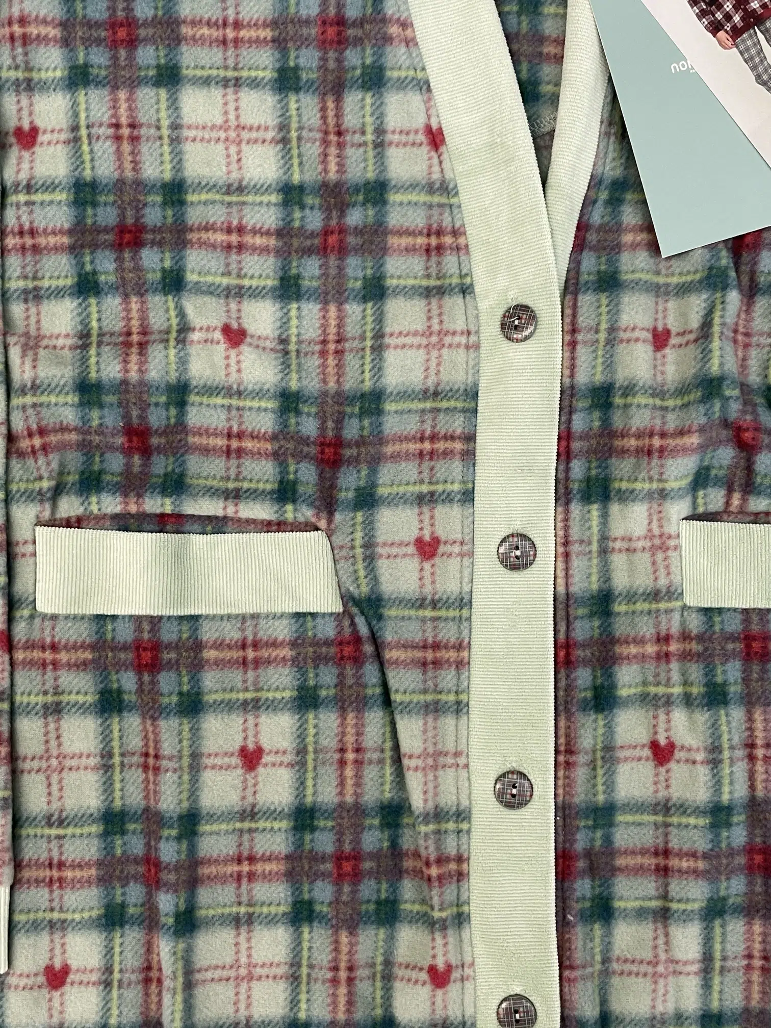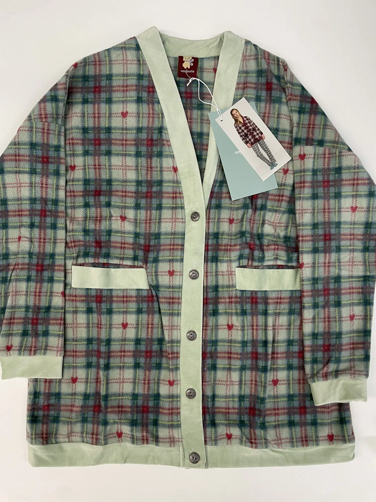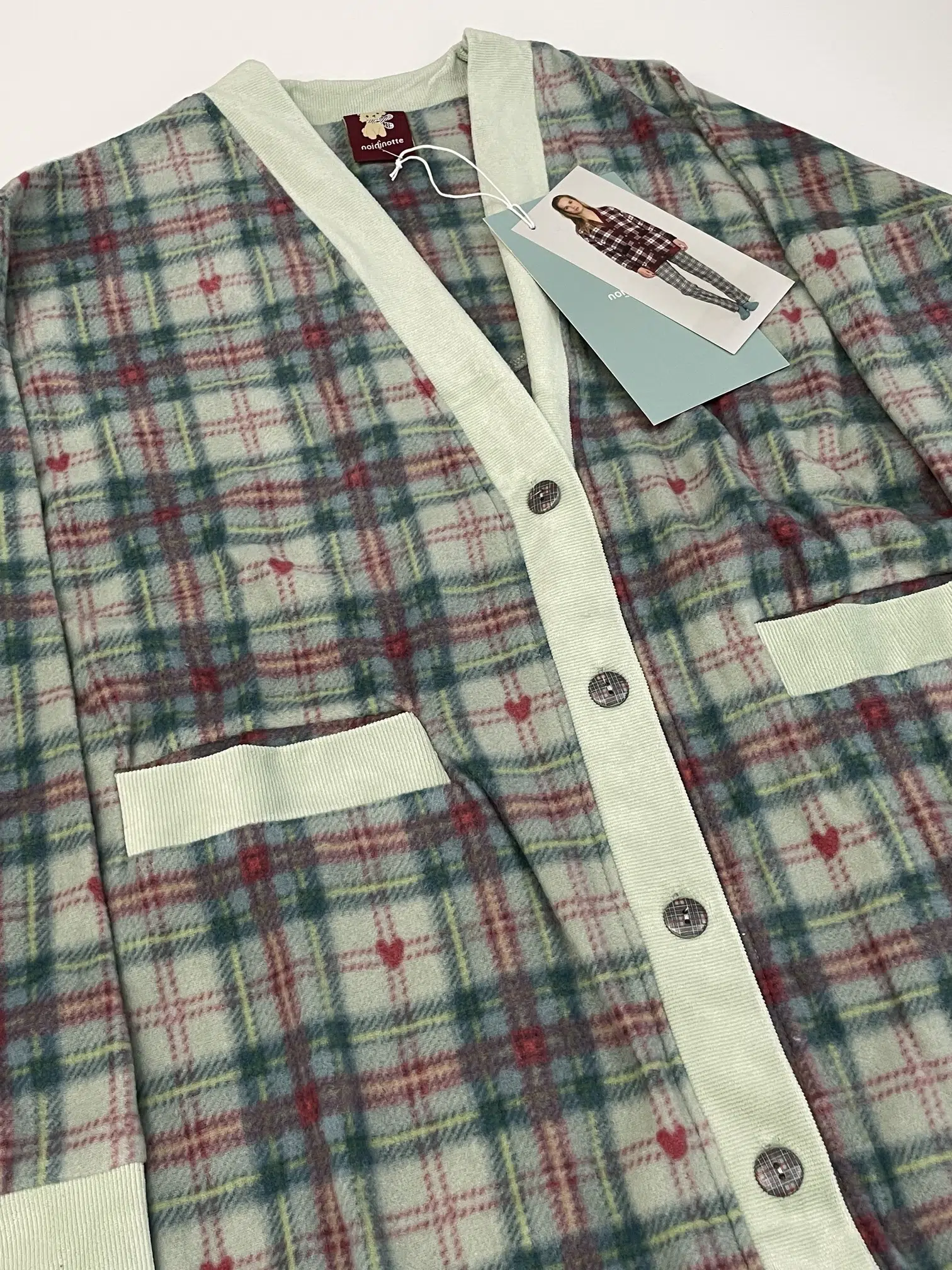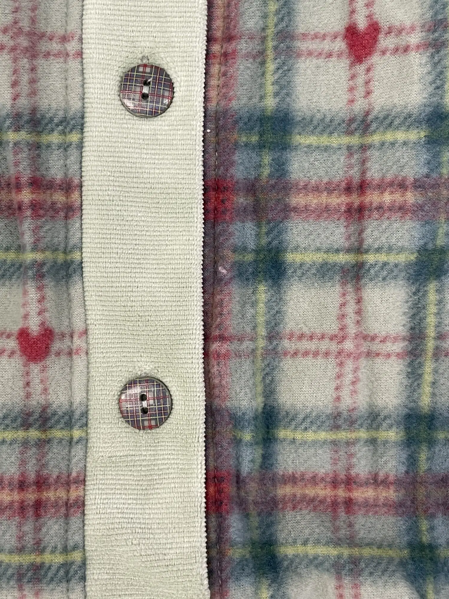 Giacca donna lily in paris in morbido pile con bottoni, comode tasche frontali con dettagli in ciniglia a coste in raffinata stampa scozzese con cuoricini