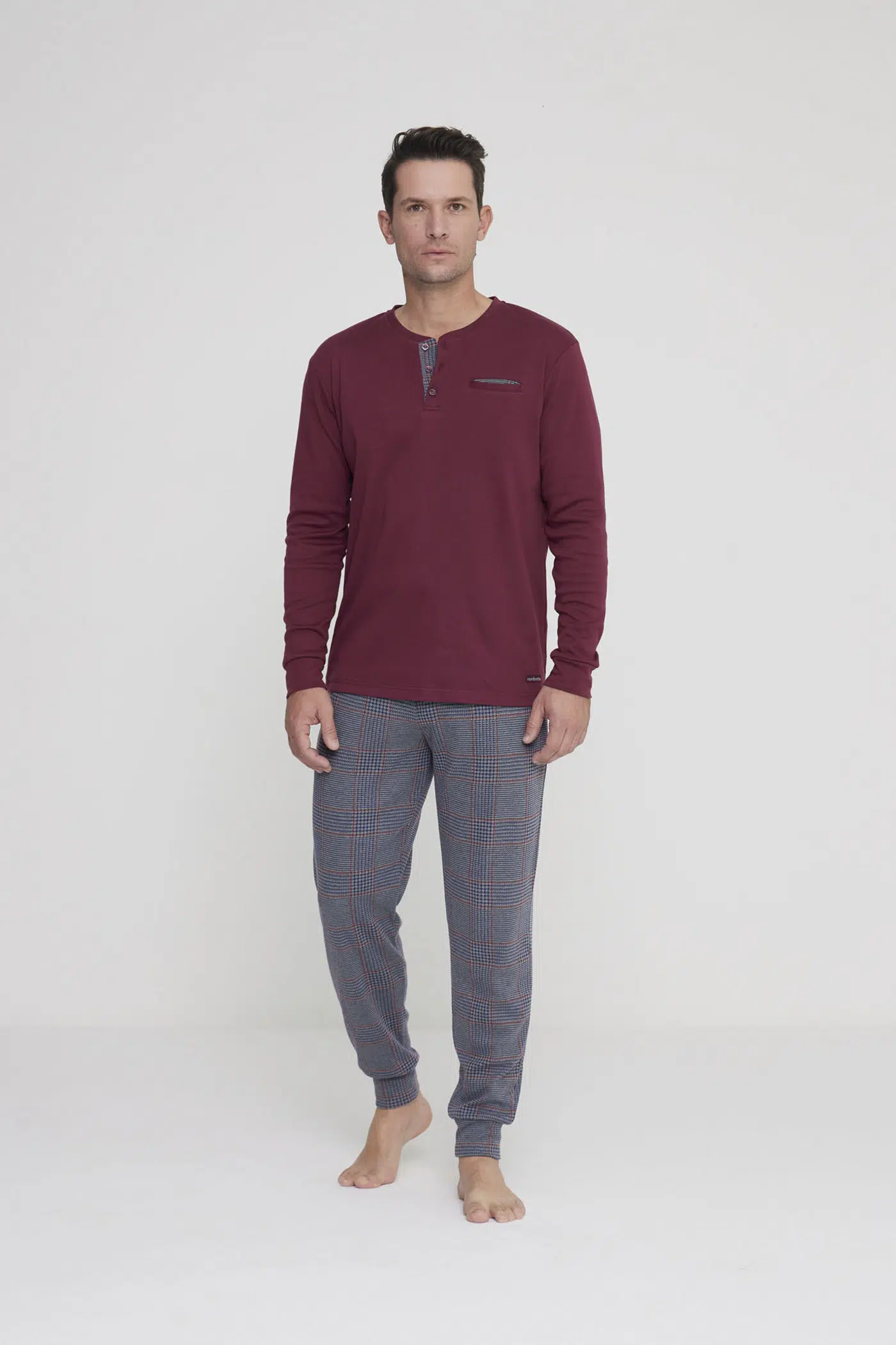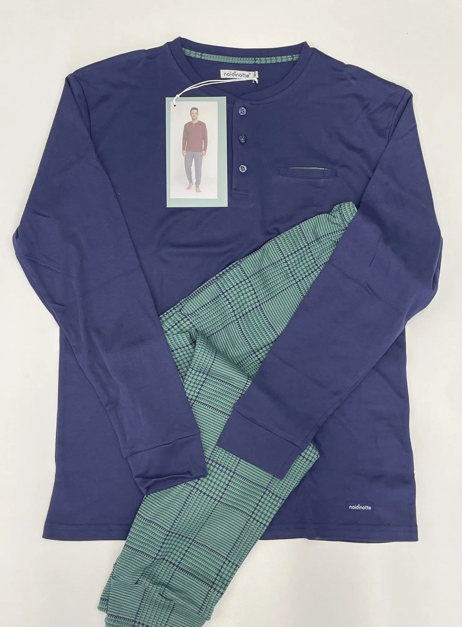 Pigiama uomo prince in morbido caldo cotone con collo tre bottoni, top tinta unita con taschino interno e pantalone in elegante stampa principe di galles con comodi polsini