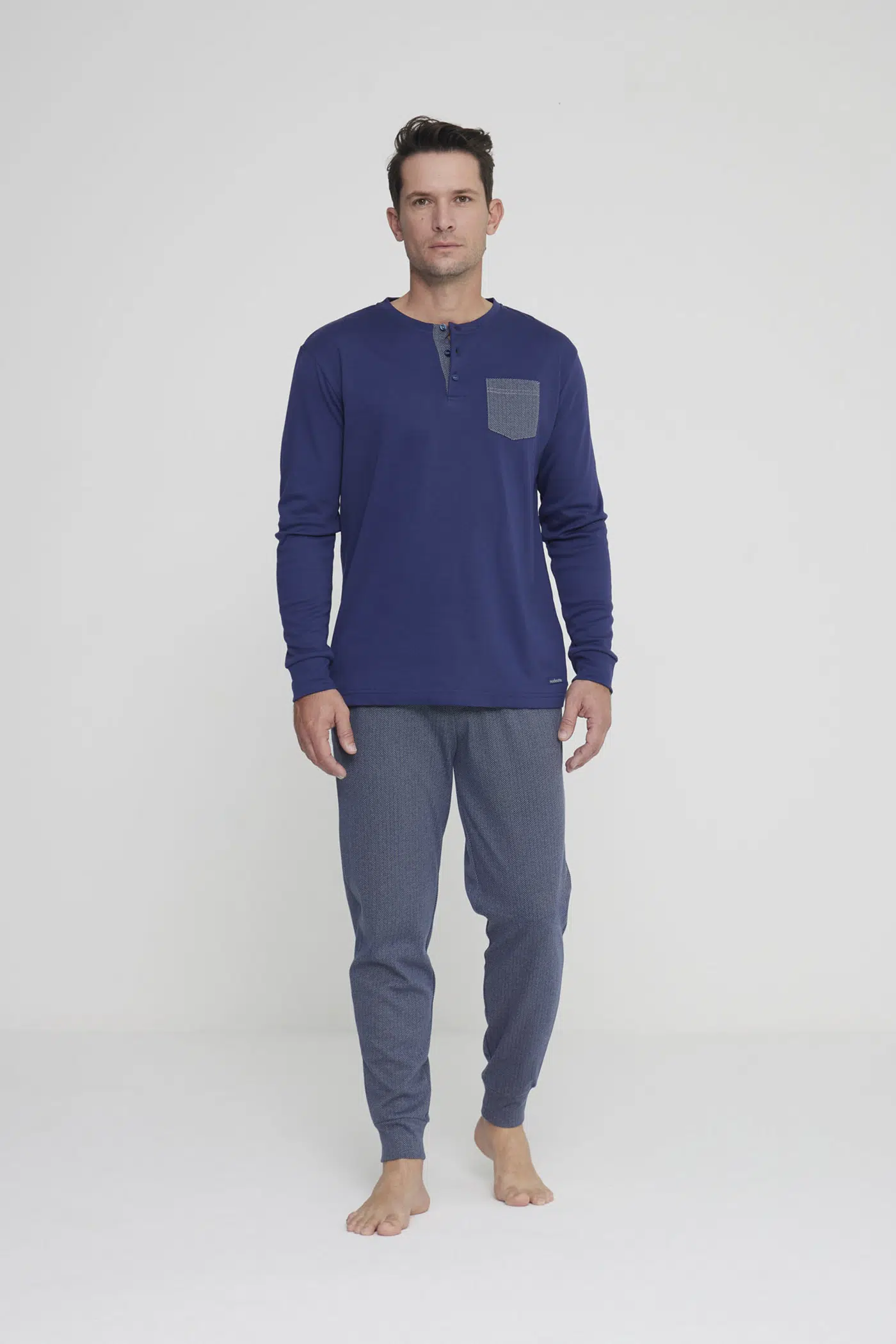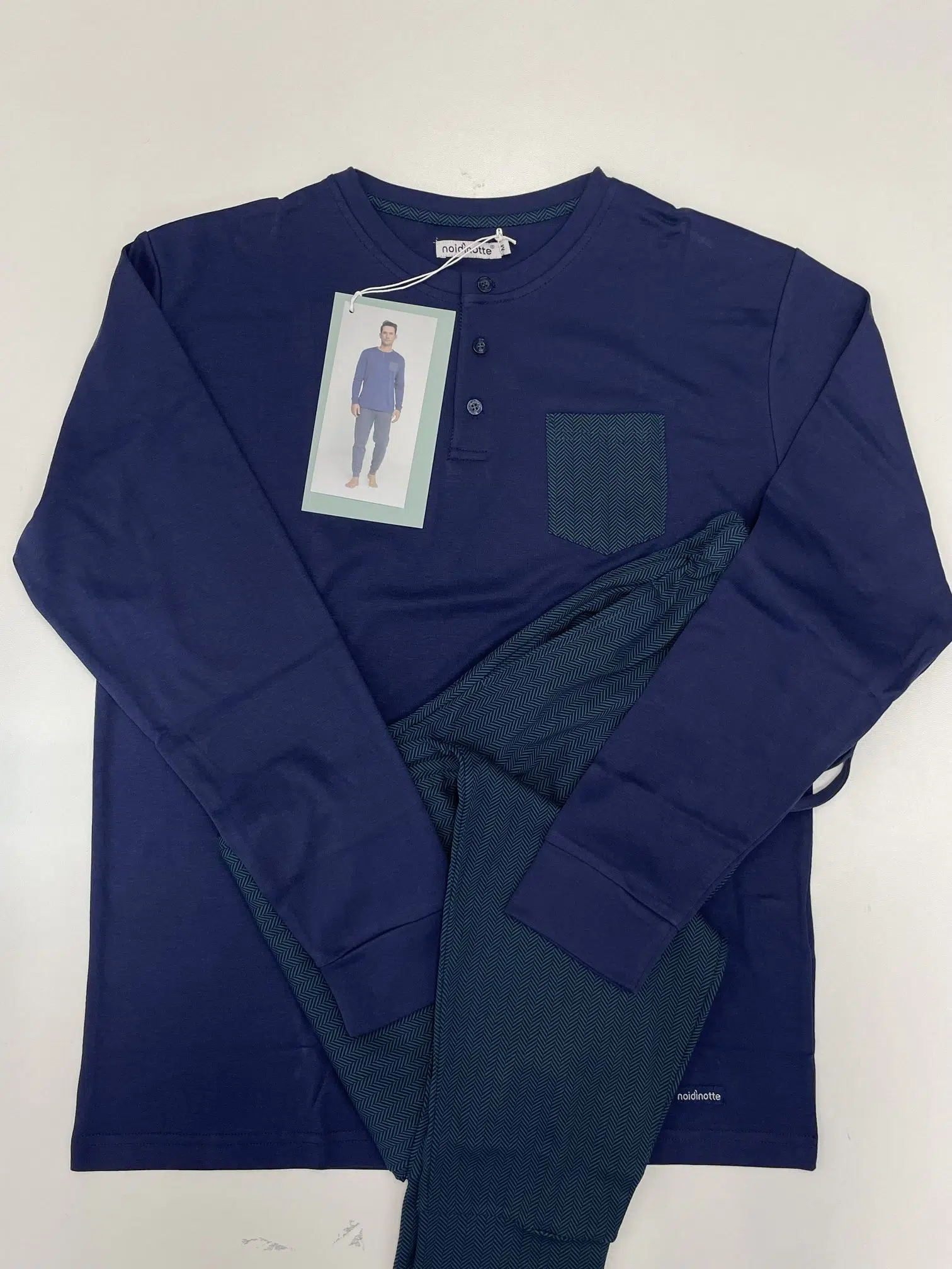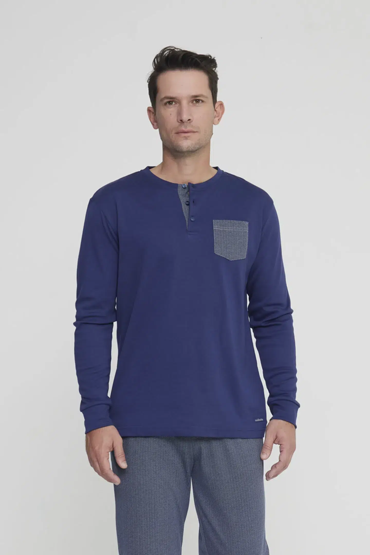 Pigiama uomo simone in morbido caldo cotone con collo tre bottoni, top tinta unita con taschino che richiama il pantalone in motivo spinato e comodi polsini