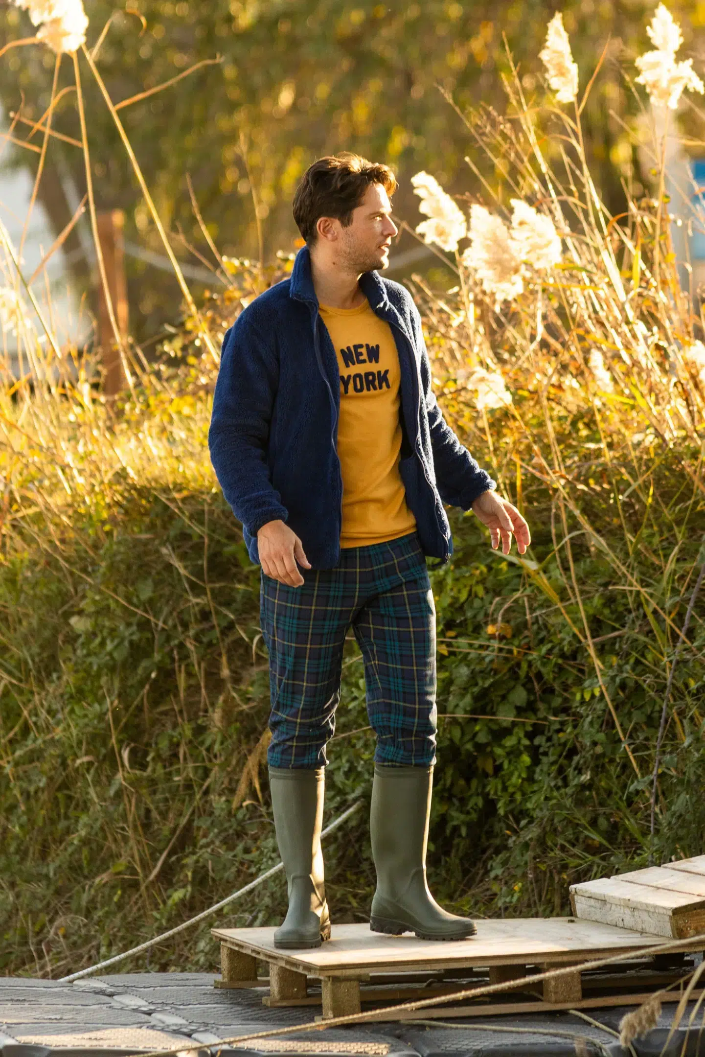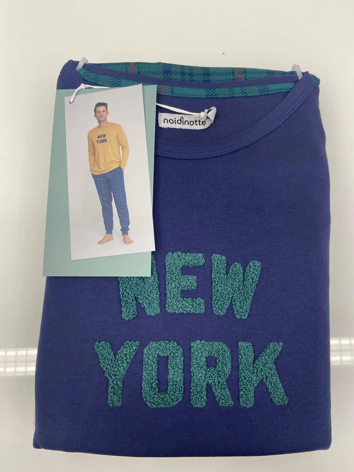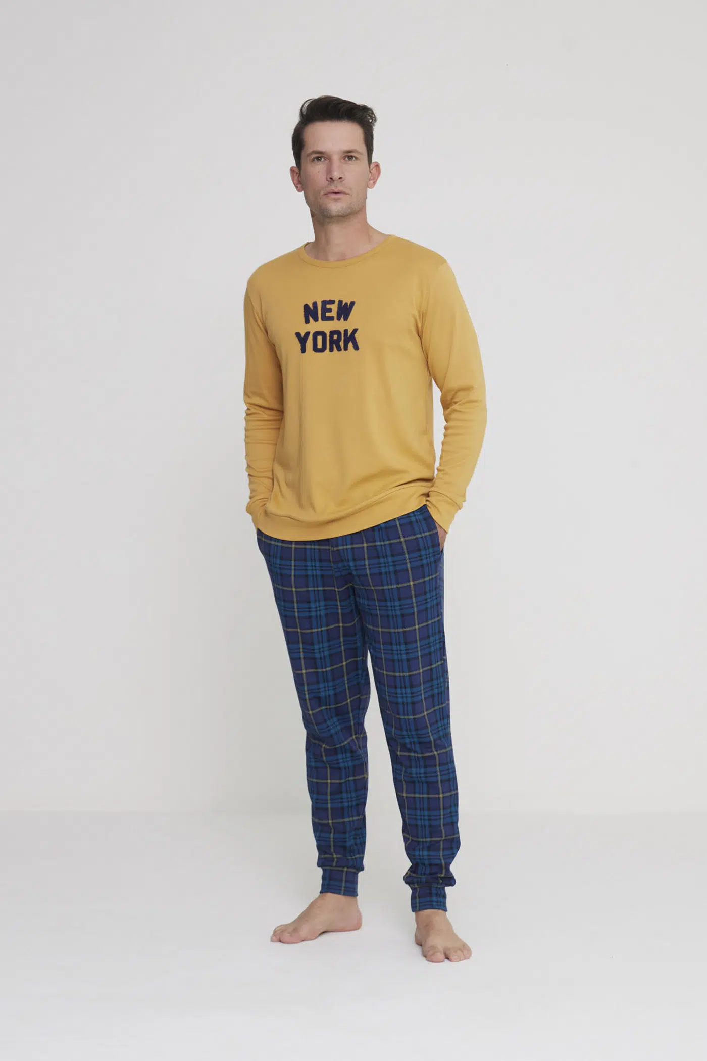Pigiama uomo york in morbido caldo cotone girocollo con applicazione new york ed elegante pantalone lungo con comodi polsini e pratiche tasche in stampa scozzese