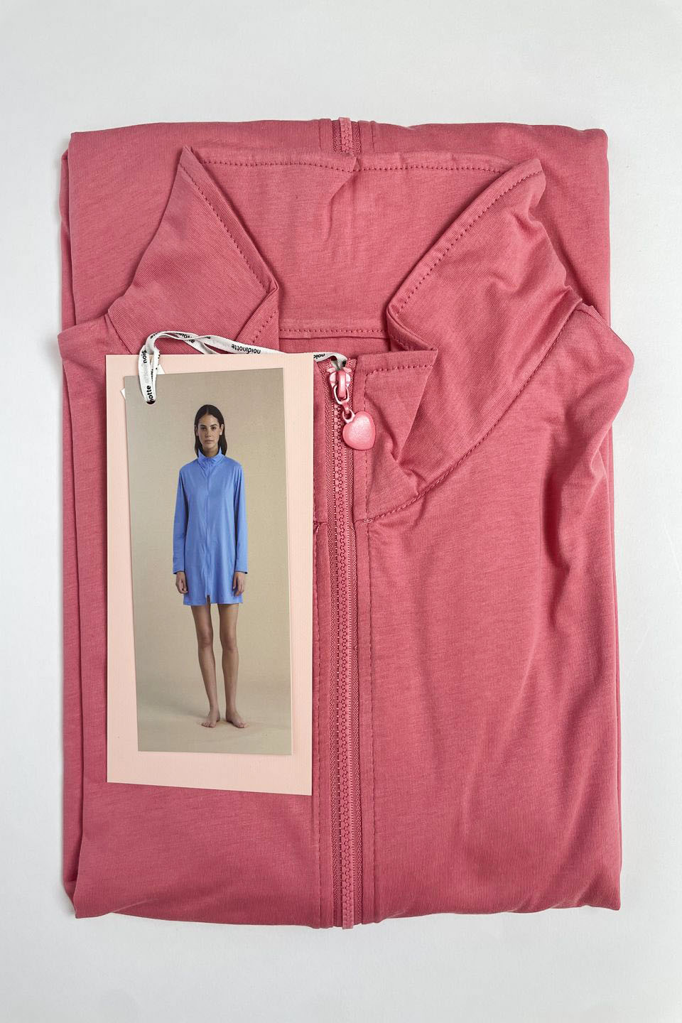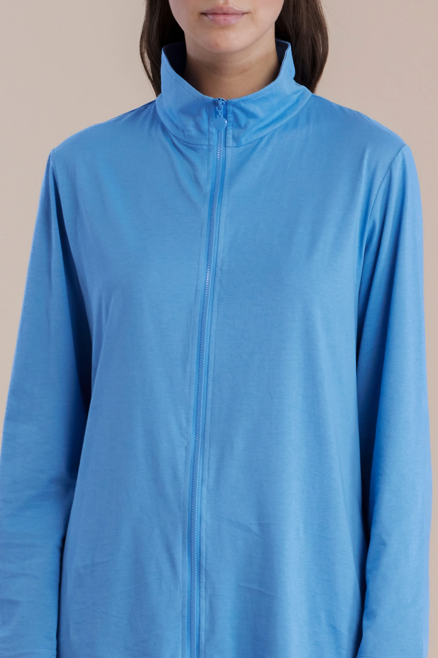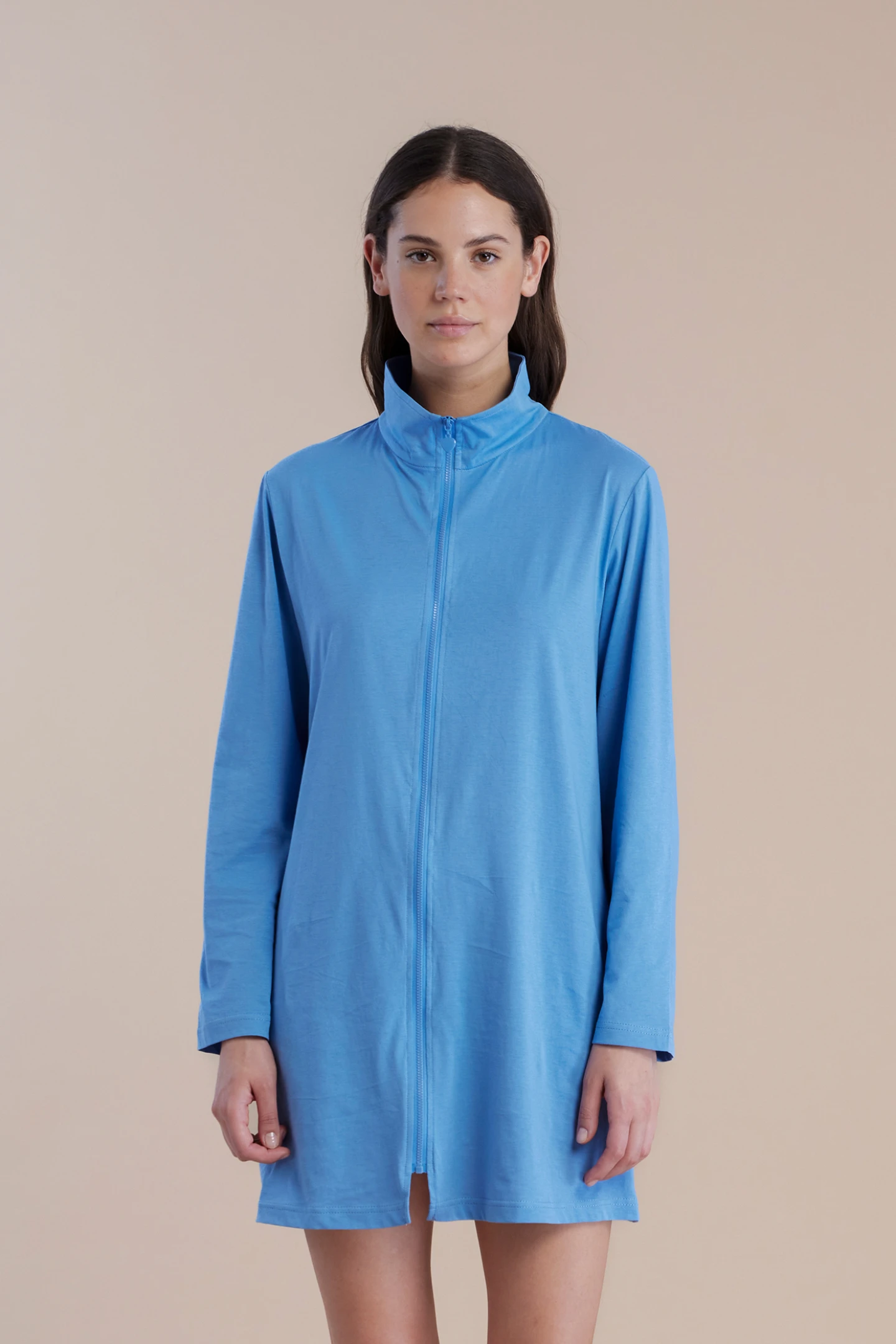 Vestaglia donna in 100% cotone con zip frontale e collo alto per un look moderno e pratico. Le maniche lunghe e il design essenziale la rendono perfetta per rilassarsi con stile.