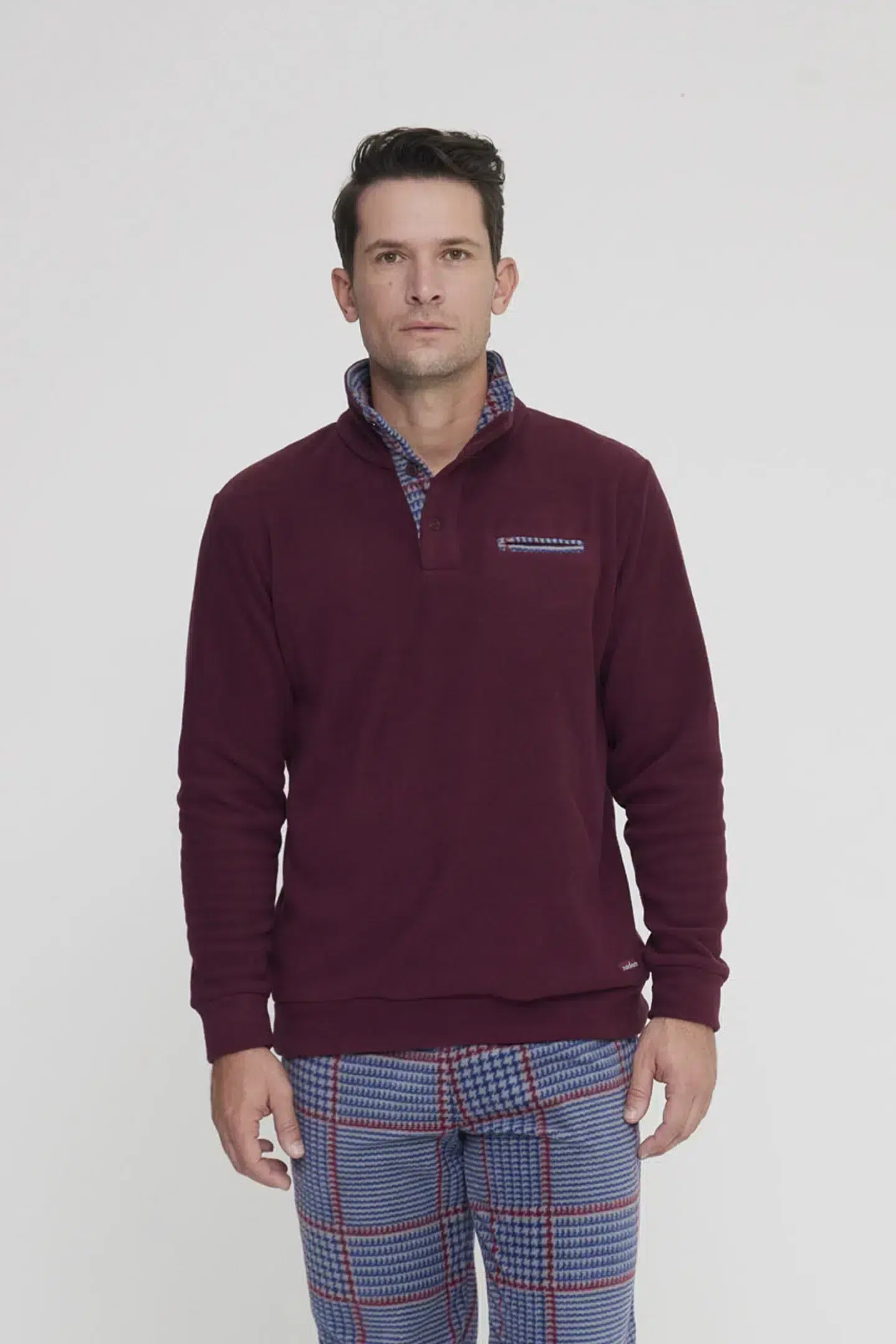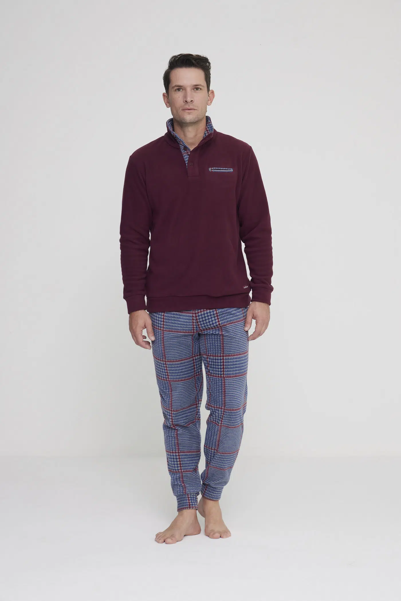 Pigiama uomo prince in caldo pile con collo tre bottoni, top tinta unita con taschino interno e pantalone in elegante stampa principe di galles con comodi polsini