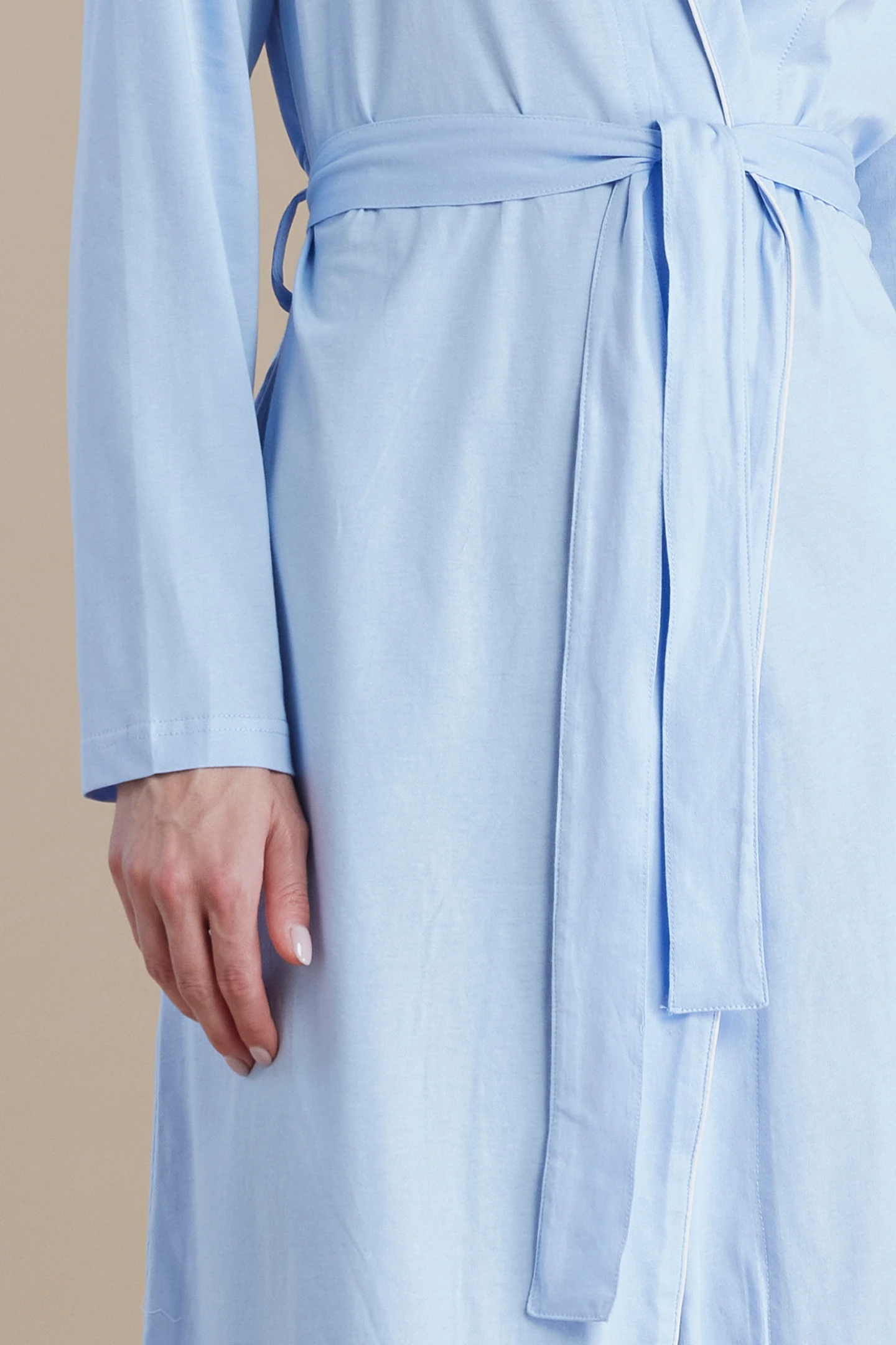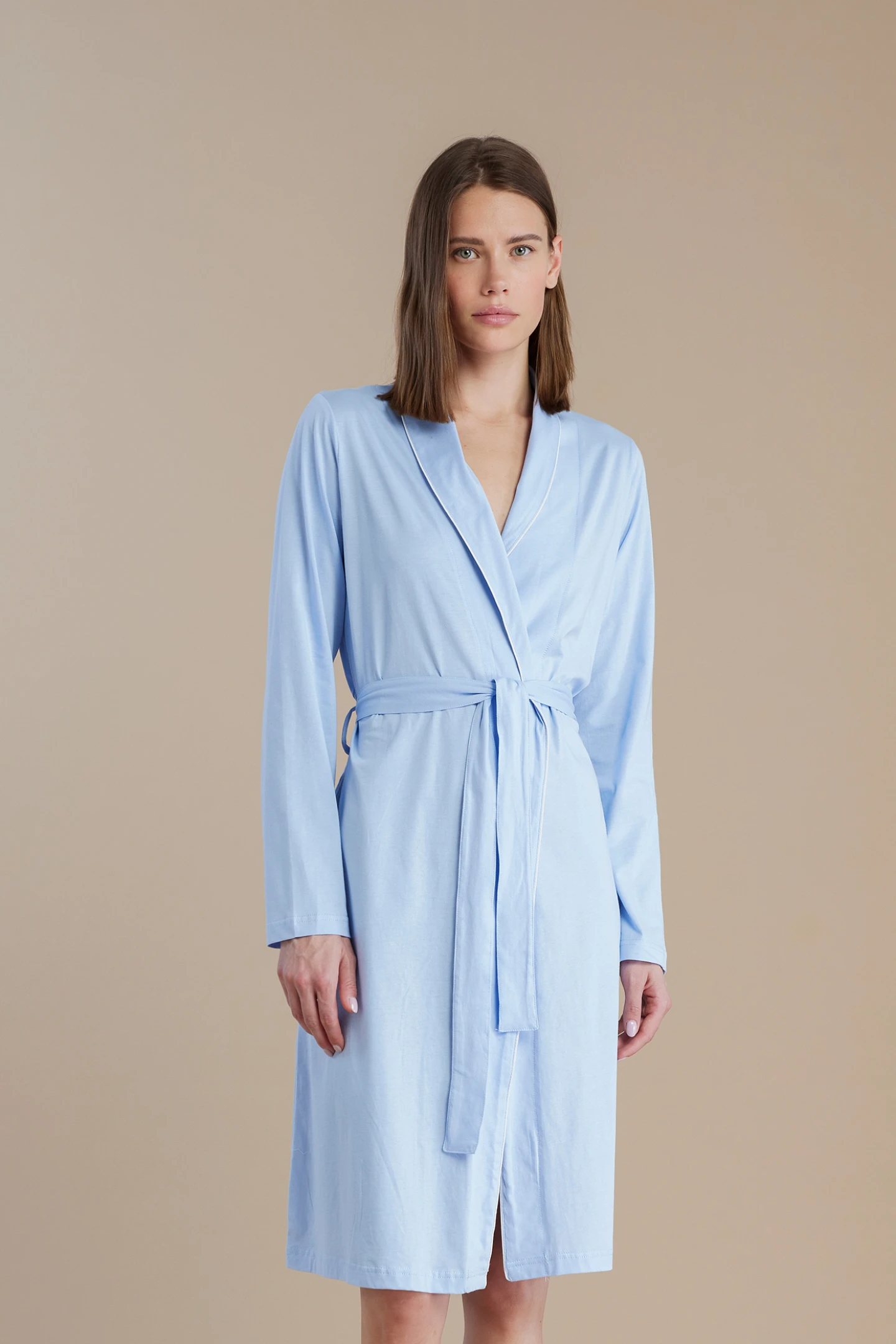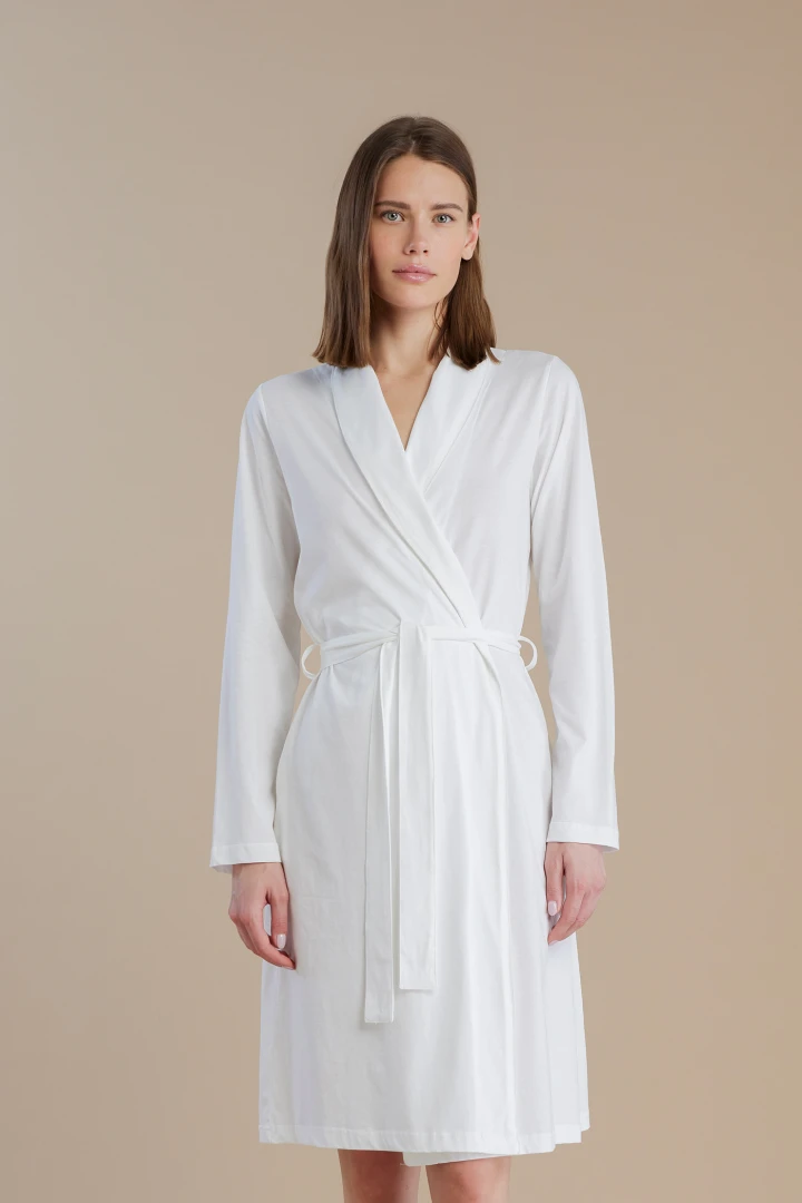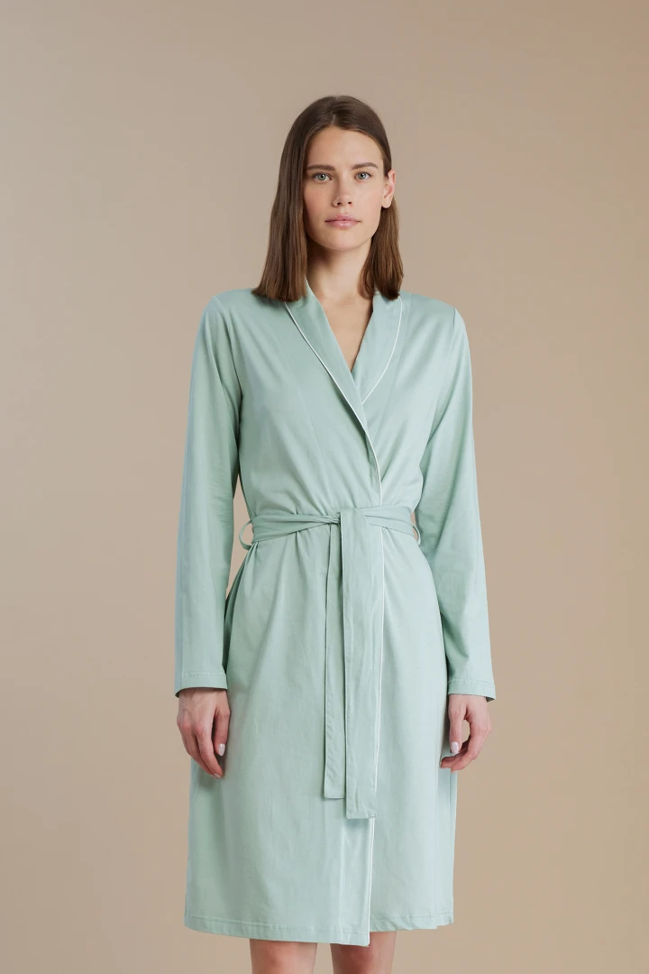 Vestaglia donna in 100% cotone con fusciacca da annodare in vita e profilo bianco a contrasto. La cintura regolabile in vita garantisce una vestibilità perfetta, avvolgendoti in un comfort morbido e avvolgente.