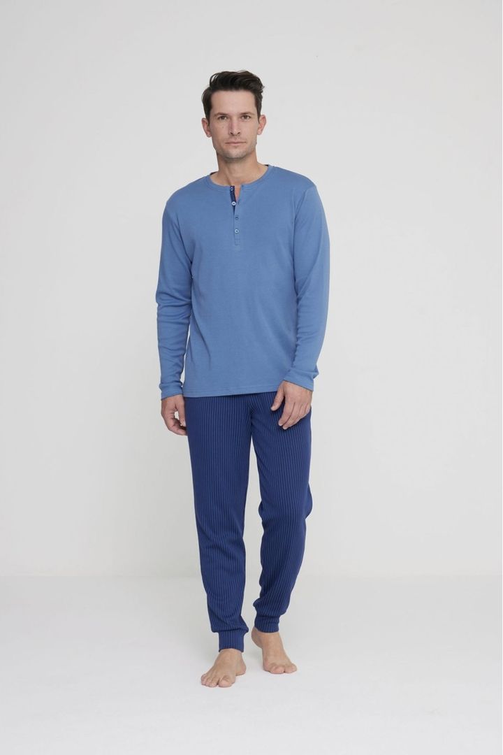 Pigiama uomo brooklyn in morbido caldo cotone con collo quattro bottoni, top tinta unita e pantalone con elegante stampa a righe e comodi polsini