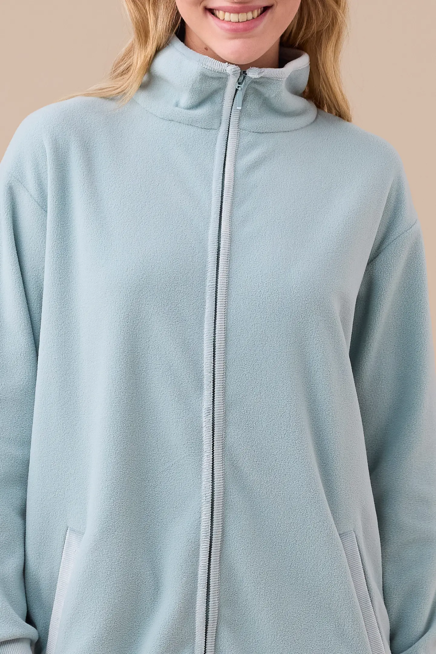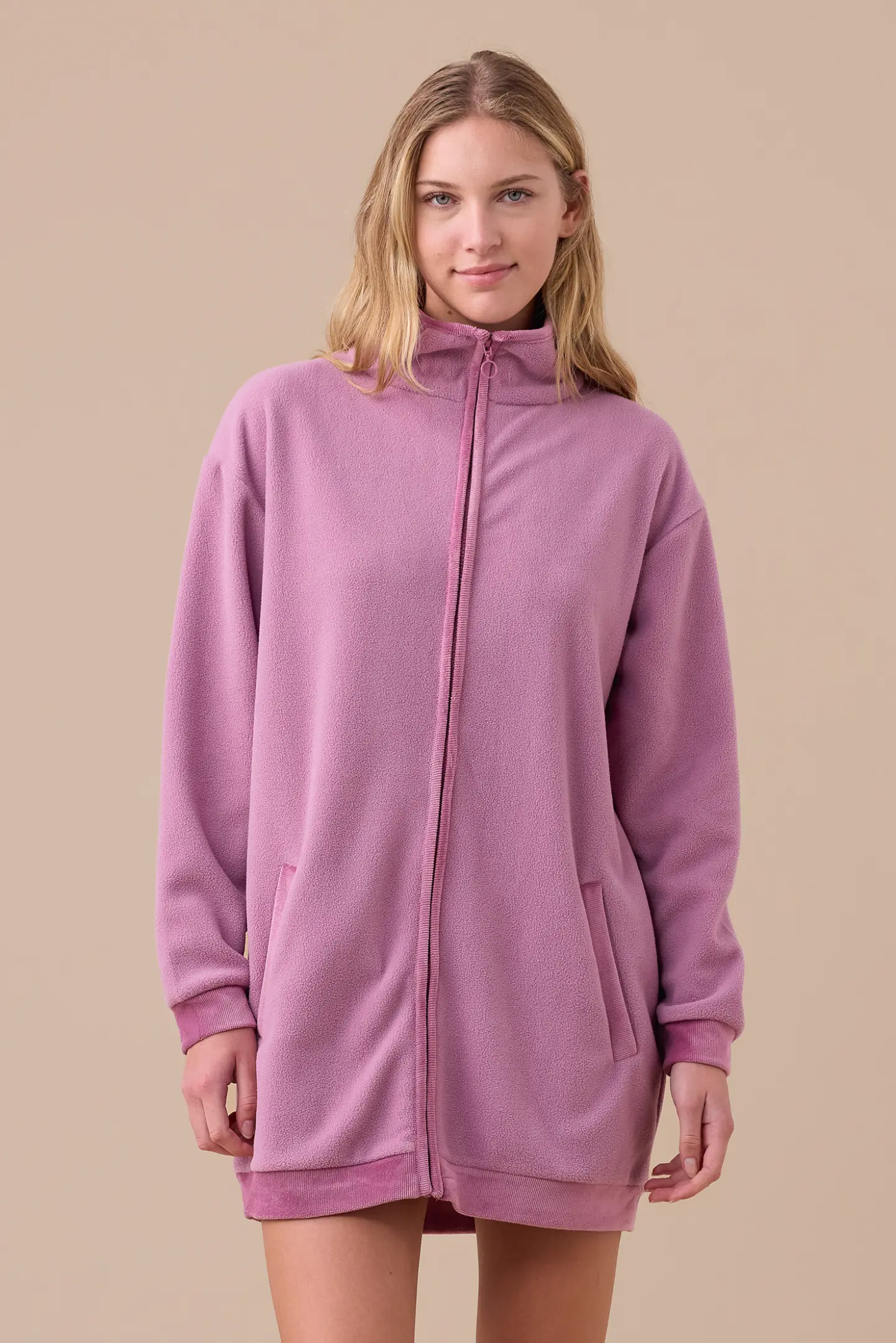 Vestaglia donna in micropile con collo alto e dettagli in ciniglia. Chiusura a zip e tasche.
