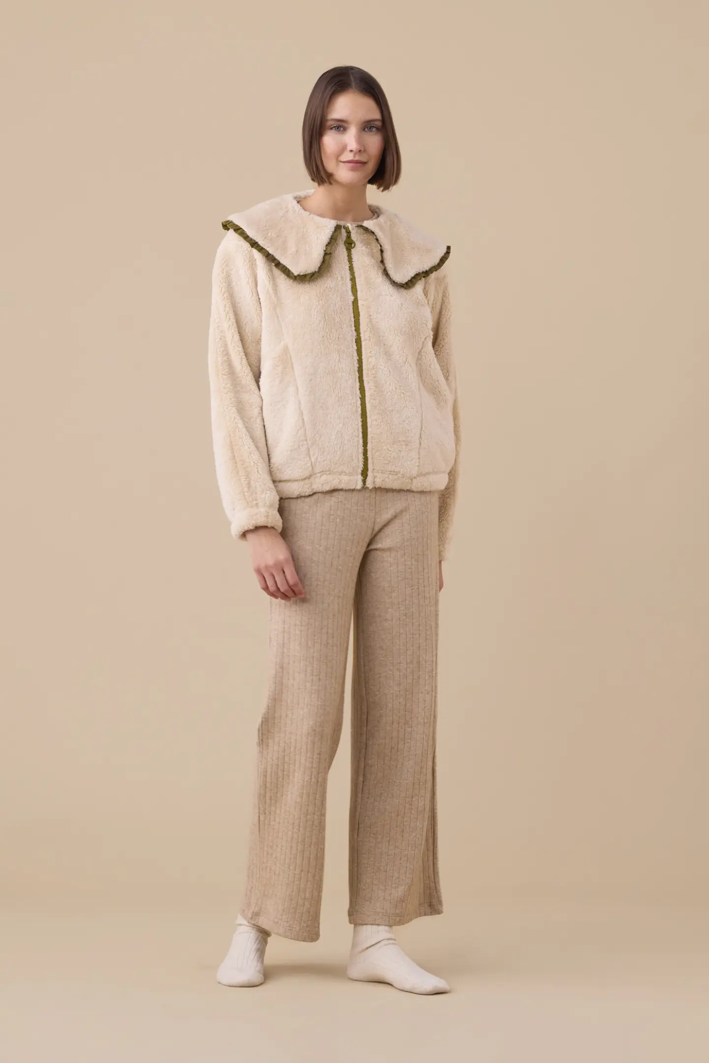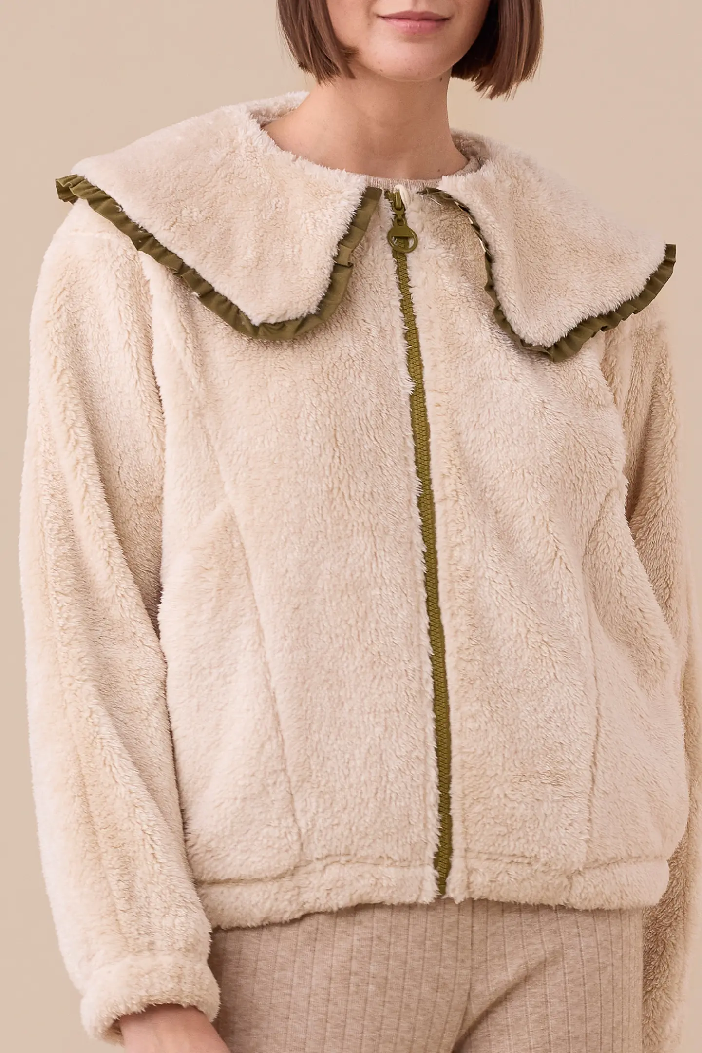 Giacca donna in eco pelliccia con colletto ampio con rouches e zip.