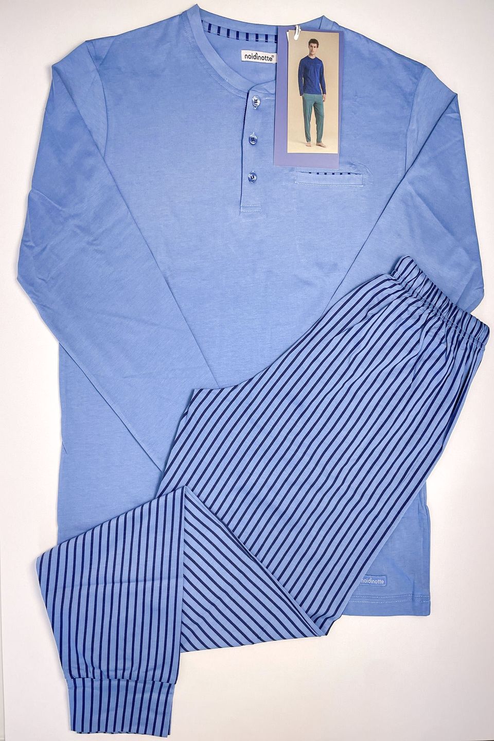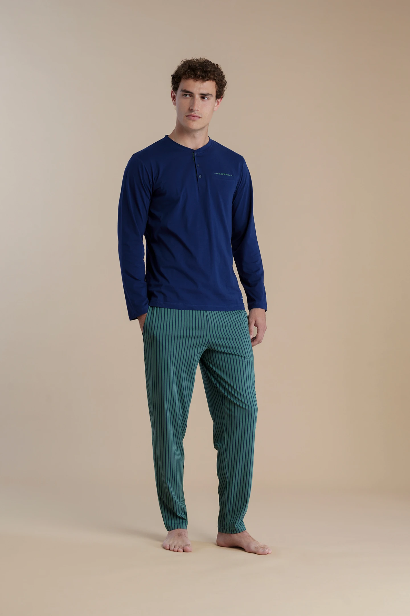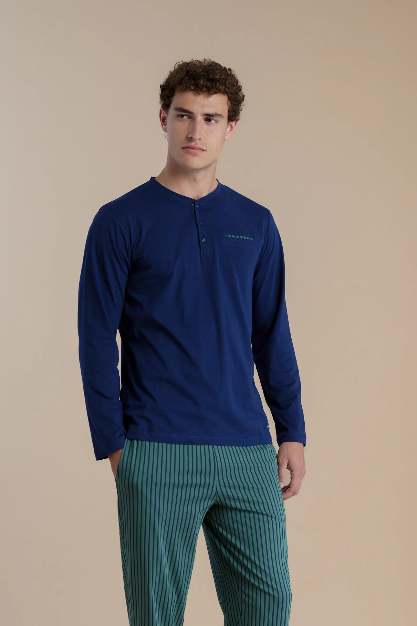 Pigiama uomo in 100% top a maniche lunghe blu, con scollo tre bottoni e dettagli sul taschino, si abbina ai pantaloni verdi a righe per un tocco classico e raffinato