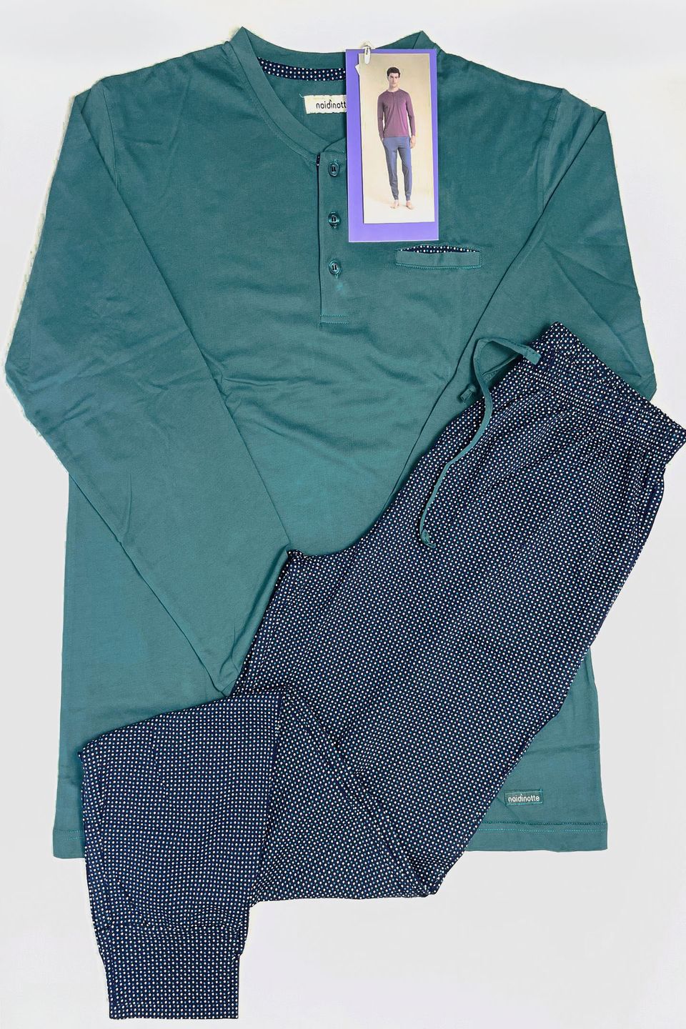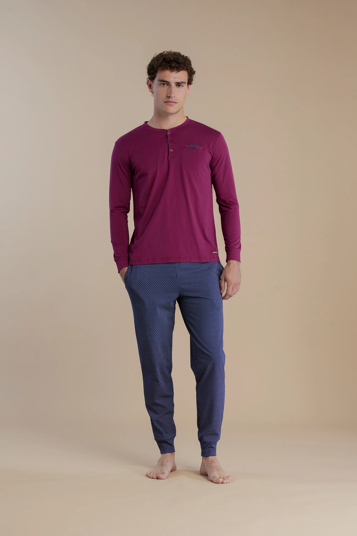 Pigiama uomo in 100% cotone con top a maniche lunghe e scollo tre bottoni. Il pantalone lungo impreziosito da una raffinata microfantasia a pois, completa il look, garantendo stile e comfort in ogni momento della notte.