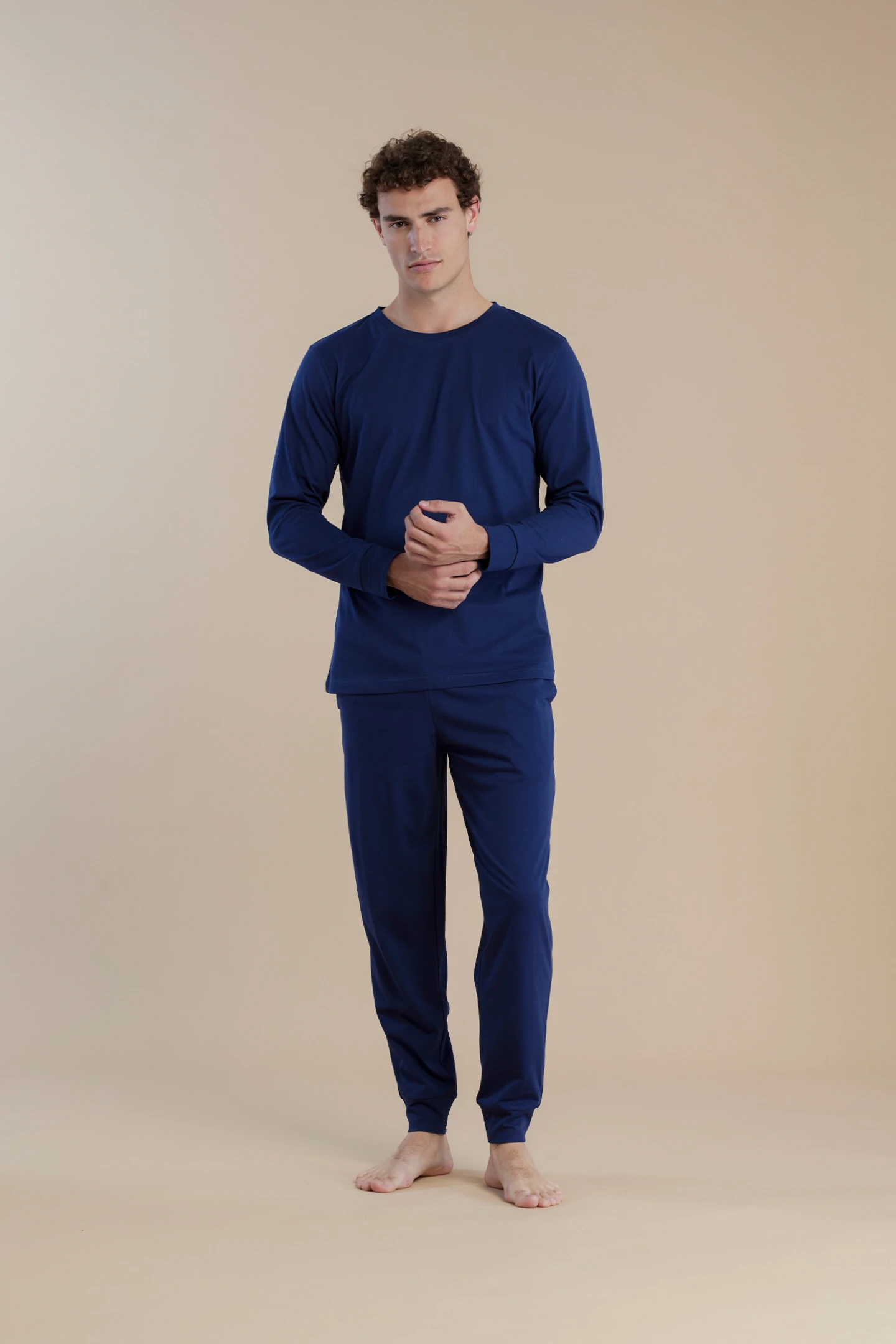 Pigiama uomo in 100% cotone il top a maniche lunghe in tonalità di blu. I pantaloni coordinati completano questo set perfetto per le serate rilassanti.