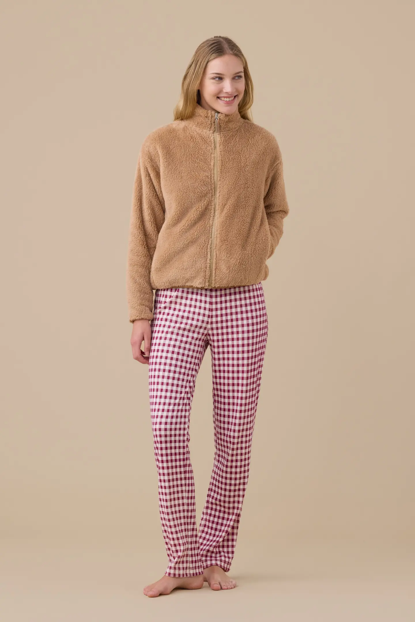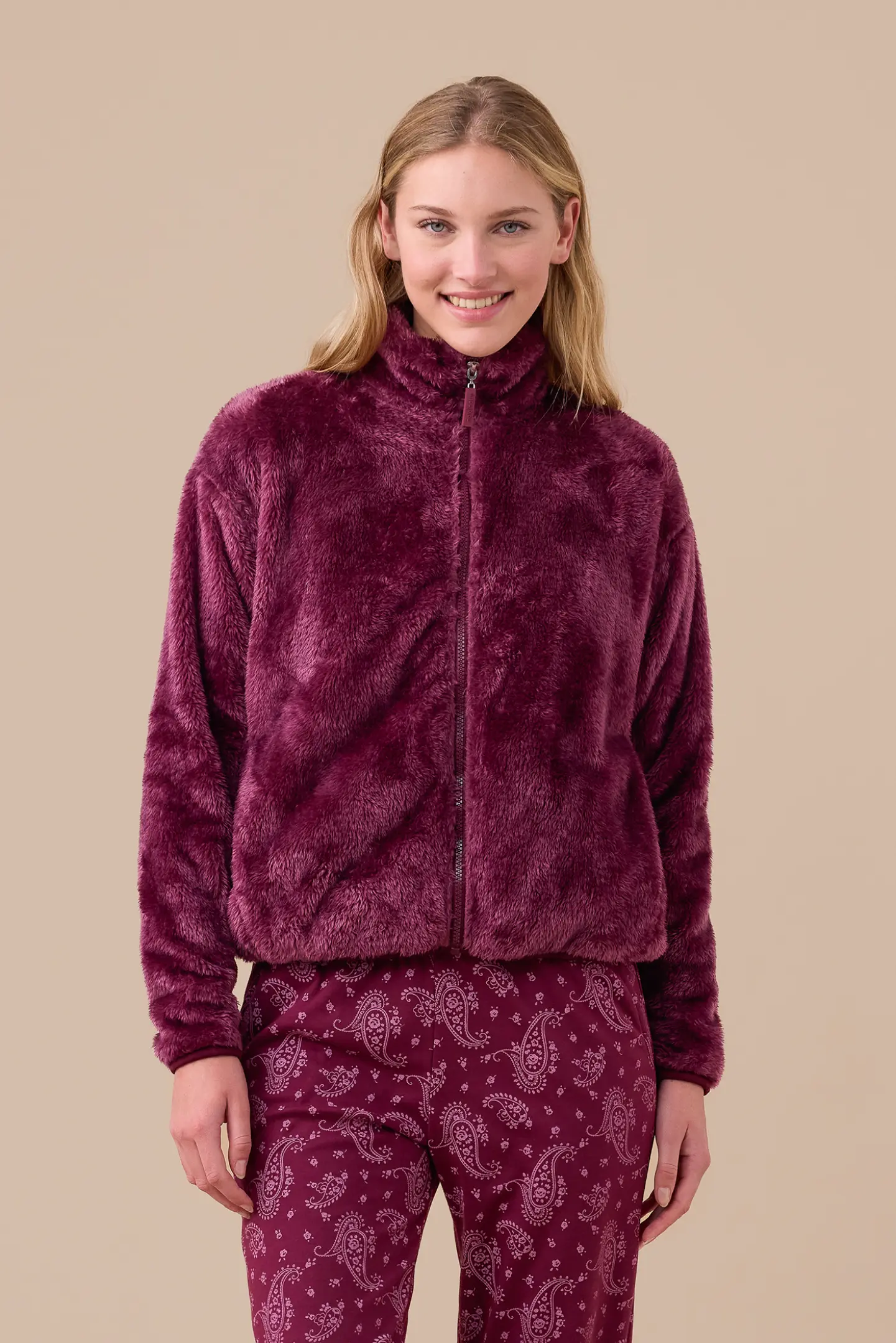 Giacca donna in eco pelliccia con chiusura zip e tasche.