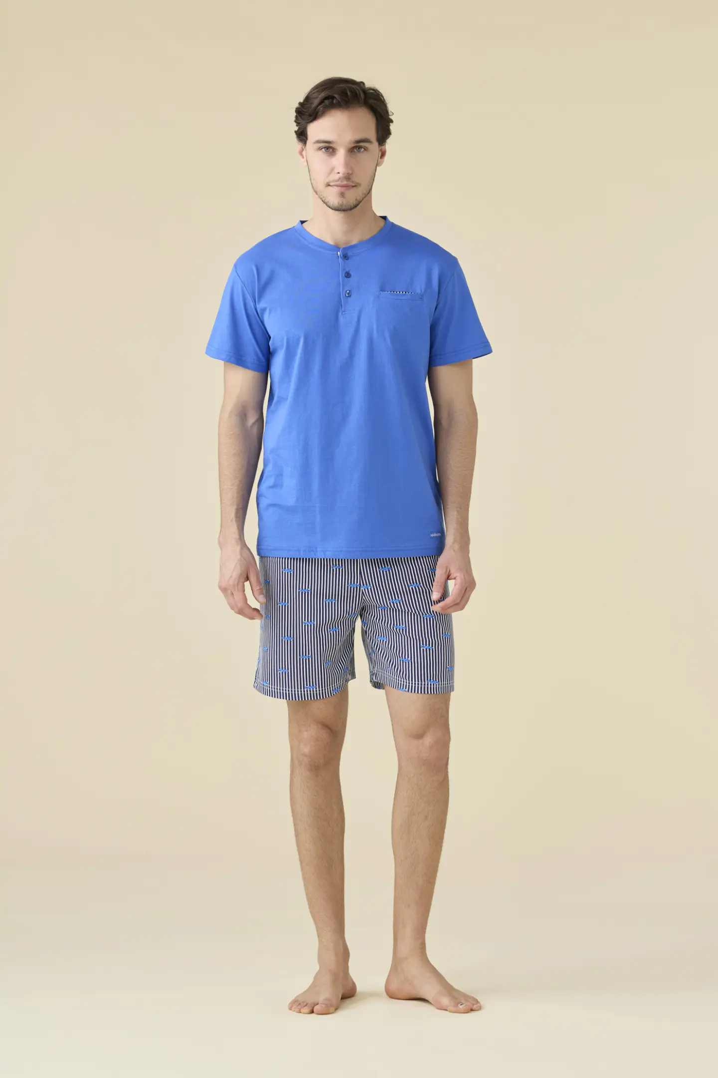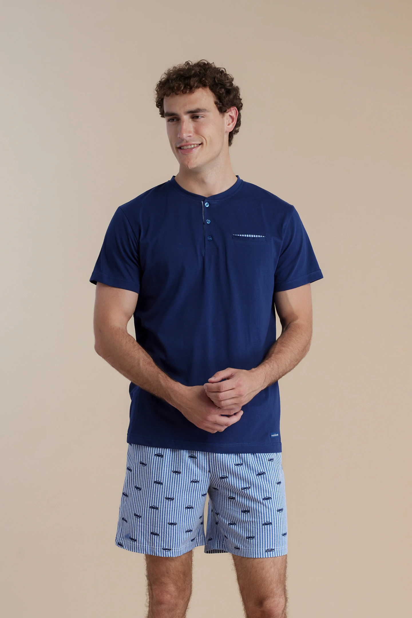Pigiama uomo in 100% cotone top maniche corte con collo tre bottoni e dettaglio taschino che si abbina ai pantaloni corti a righe blu e bianche, arricchiti da una microfantasia