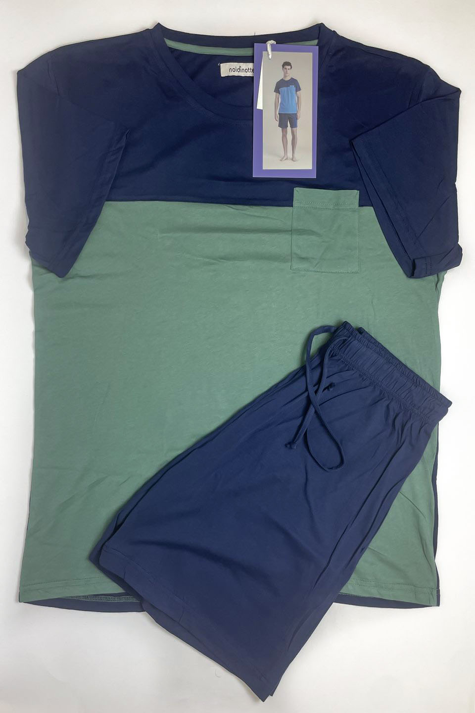 Pigiama uomo in 100% cotone top manica corta presenta un elegante bicolore in sfumature di blu, con un pratico taschino. I pantaloni corti coordinati completano il look casual ideale per le notti estive.