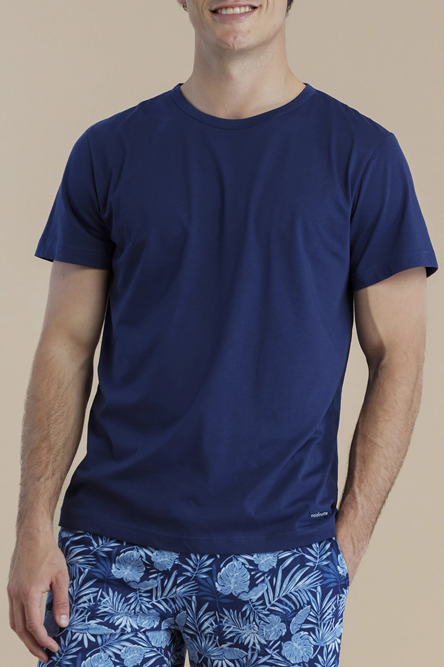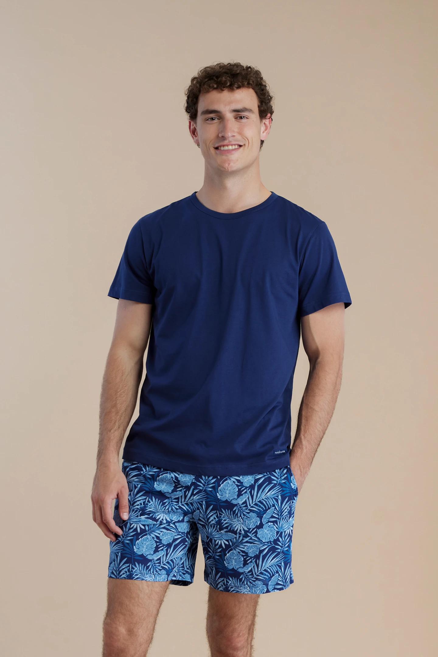 Pigiama uomo in 100% cotone top maniche corta in tinta unita girocollo e pantaloni corti con stampa tropicale completano il look, garantendo comfort e libertà di movimento.