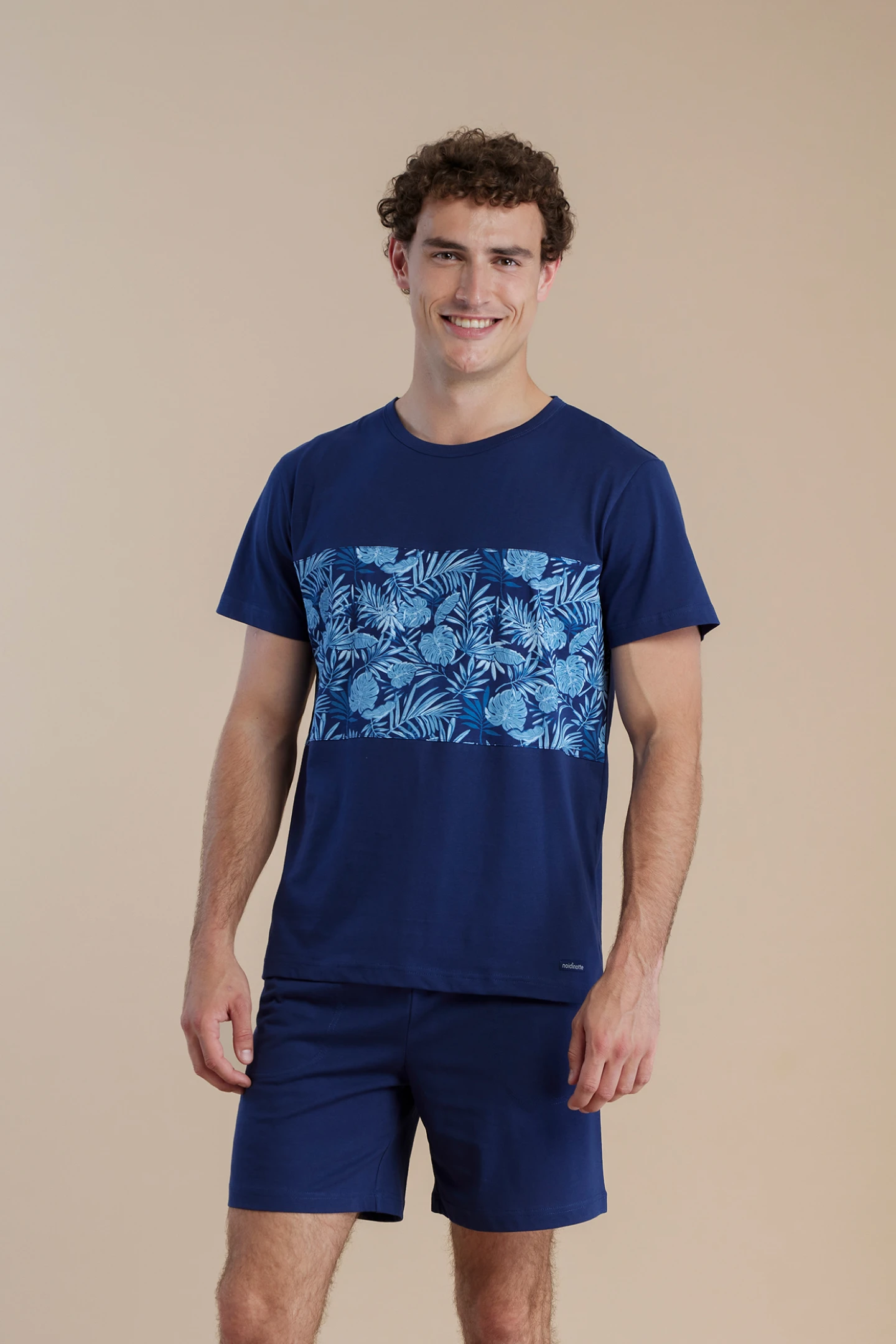 Pigiama uomo in 100% cotone top maniche corte con stampa tropicale centrale che richiama la freschezza dell’estate. I pantaloni corti coordinati completano il look, garantendo comfort e libertà di movimento.