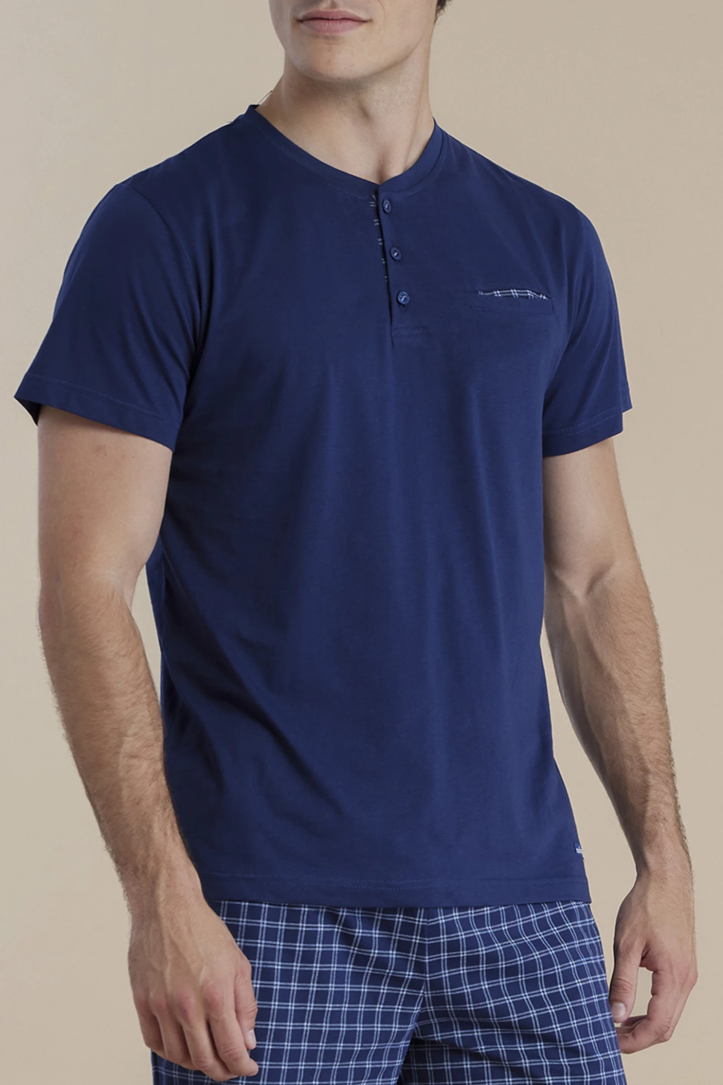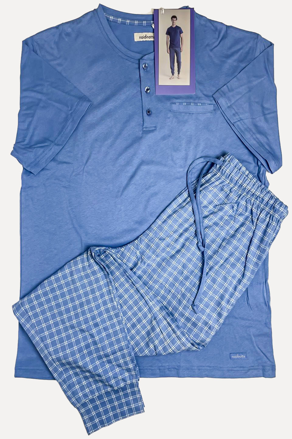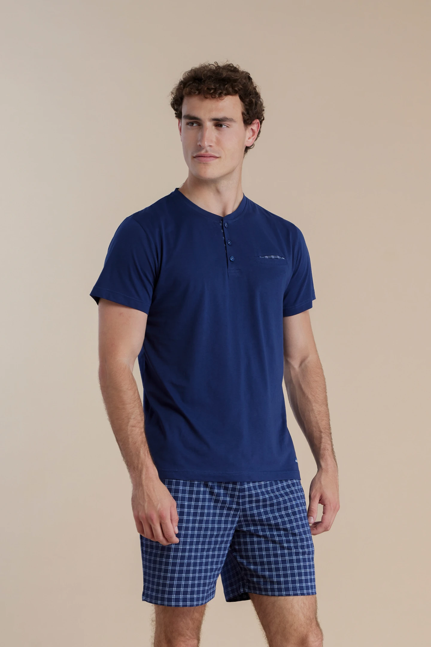 Pigiama uomo plus in 100% cotone tre pezzi top manica corta con collo tre bottoni e taschino, pantalone corto con stampa a quadri e pantalone lungo con comodi polsini che garantiscono comfort e libertà di movimento